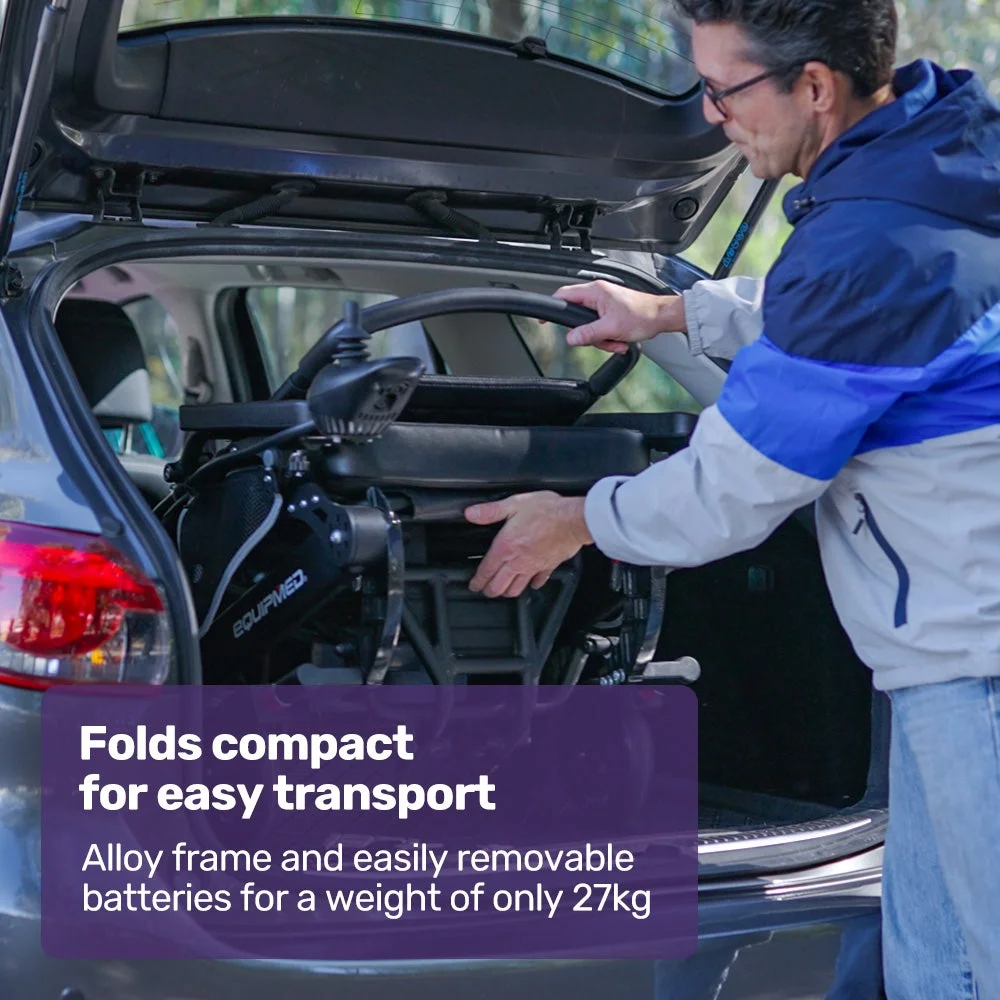 The Equipmed motorised wheelchair is quick to fold. Plus, an alloy frame and easy-to-remove lithium battery mean that it is as light as possible for loading into a car boot or moving into a space-saving storage position.