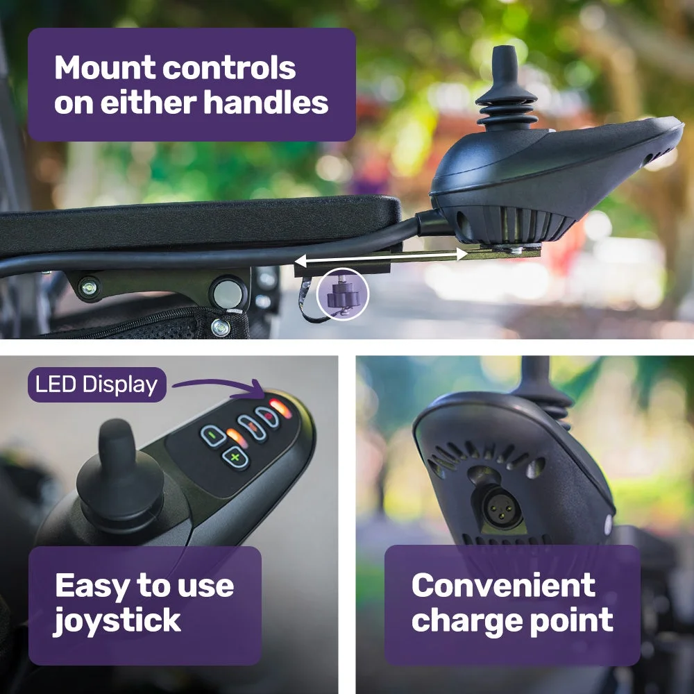 Steering is intuitive using the joystick that can be mounted on either the left or right-hand side, and with easy-to-read LED controls. You can travel along at a sensible speed of up to 6km/h, which is a brisk walking pace.