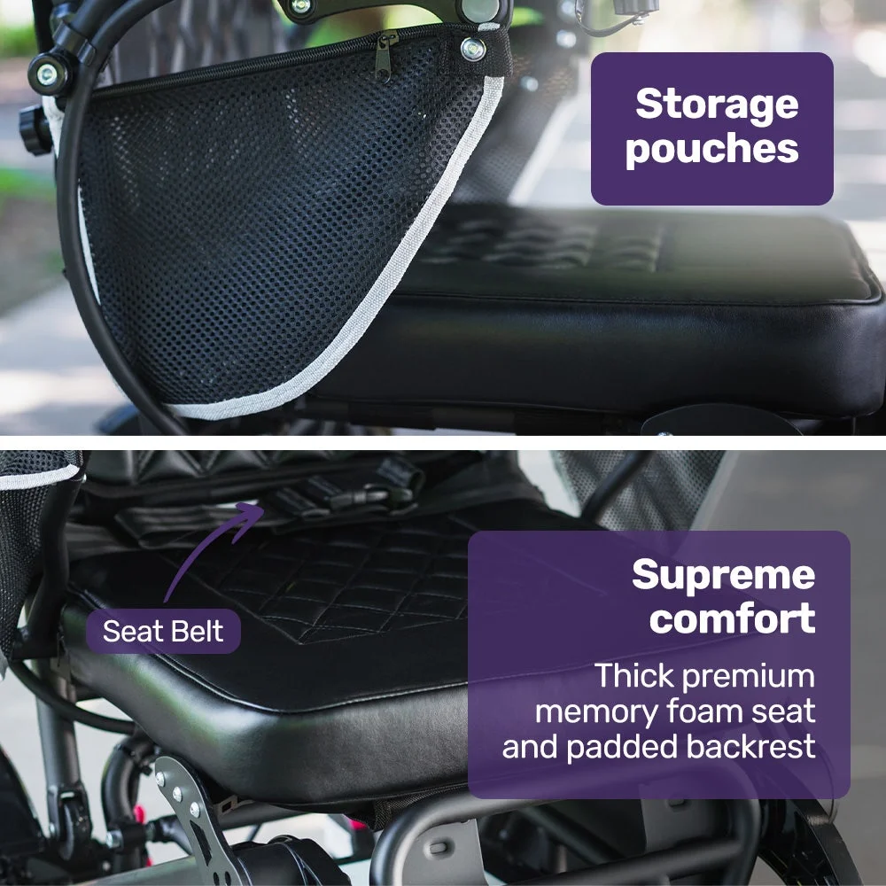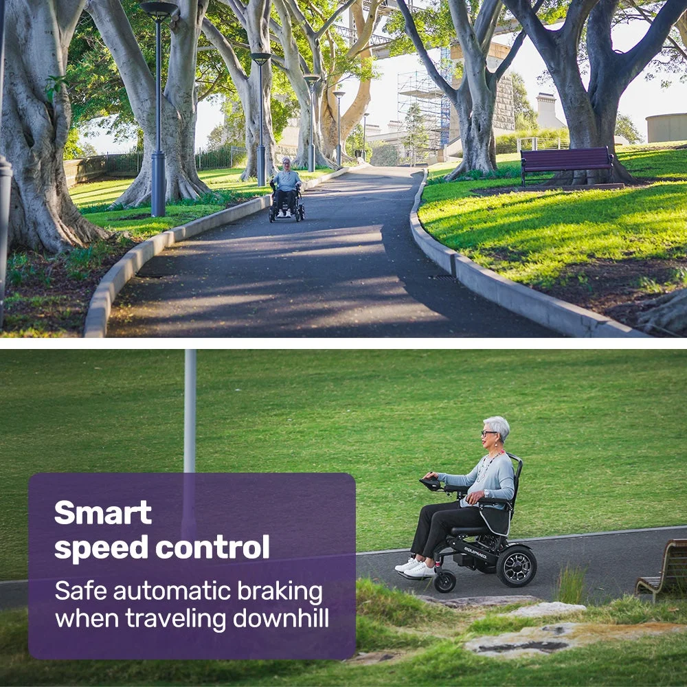 Twin motors offering a total of 500 watts offer an enjoyable riding experience with smooth and responsive performance, not to mention the ability to climb hills and ramps right up to a 15-degree incline! A tight 1m turning circle offers the manoeuvrability you need on paths and in places like shopping centres and airports.