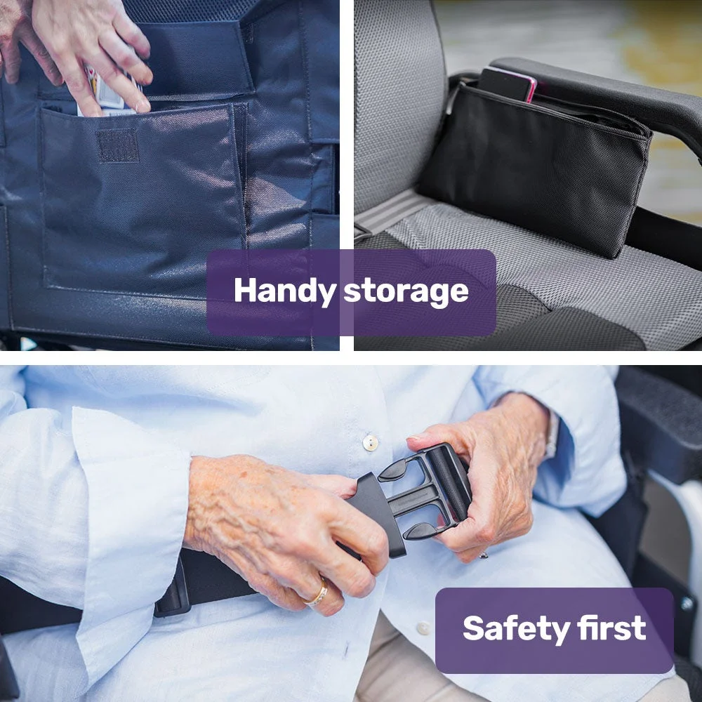 There are easily accessible mesh pockets under each armrest as well as a reading material pouch behind the backrest. Easily removable and machine washable seat and backrest cover for convenience.