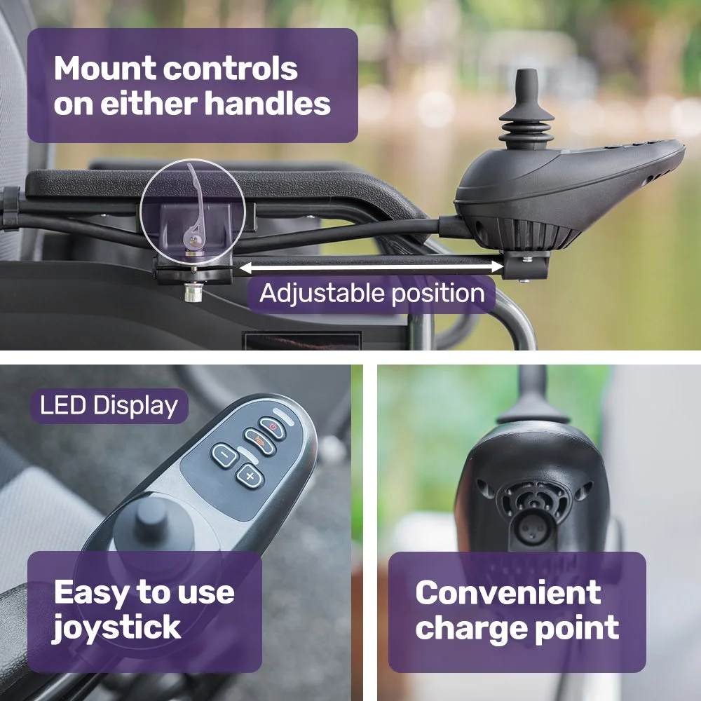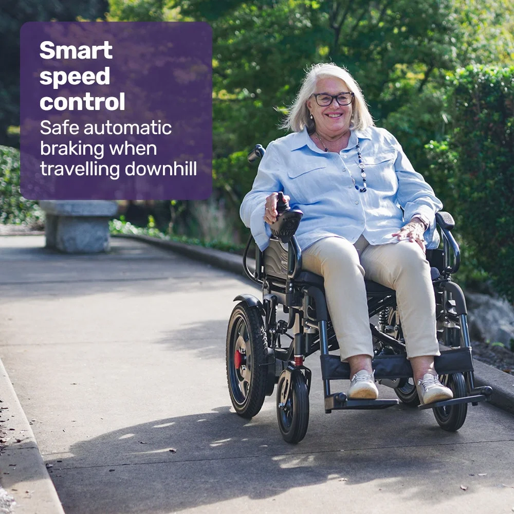The Equipmed motorised wheelchair is quick to fold. Plus, a sturdy steel frame and easy-to-remove lithium battery mean that it is as light as possible for loading into a car boot or moving into a space-saving storage position.