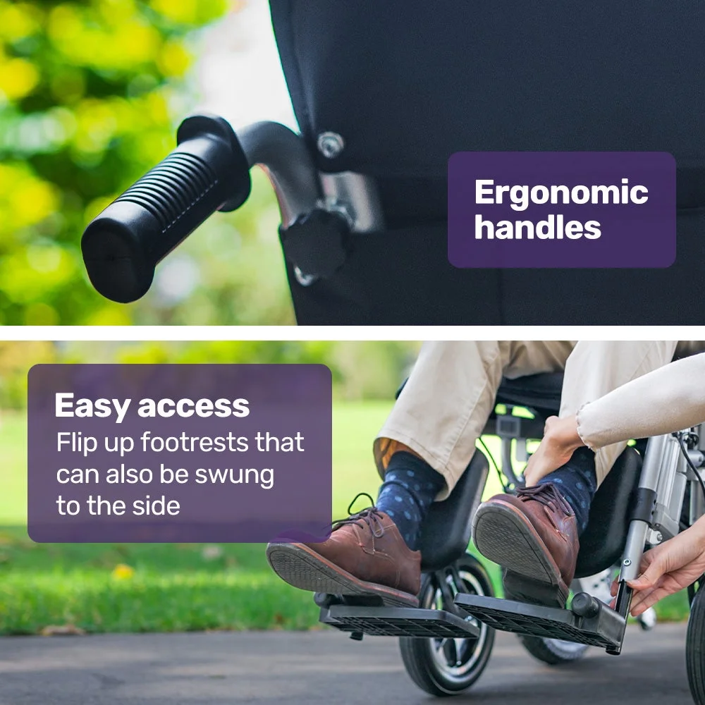 Getting on and off this Equipmed Power Wheelchair is easy thanks to swing-up armrests and the swing-up footrest. The retracting armrests also give you the option of dining at a table.