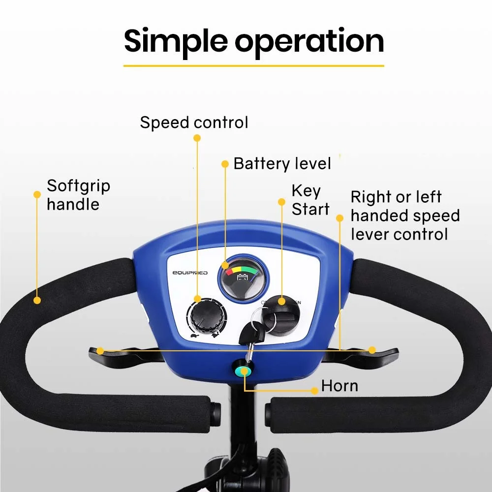 Equipmed regard safety and quality as paramount for their products, and the SmartRider Motorised Mobility Scooter is no exception. It features electronic incline braking, integrated anti-tip wheels, and reflectors. Theres a horn for alerting others, however it may be used more for simply showing off the new pride and joy!