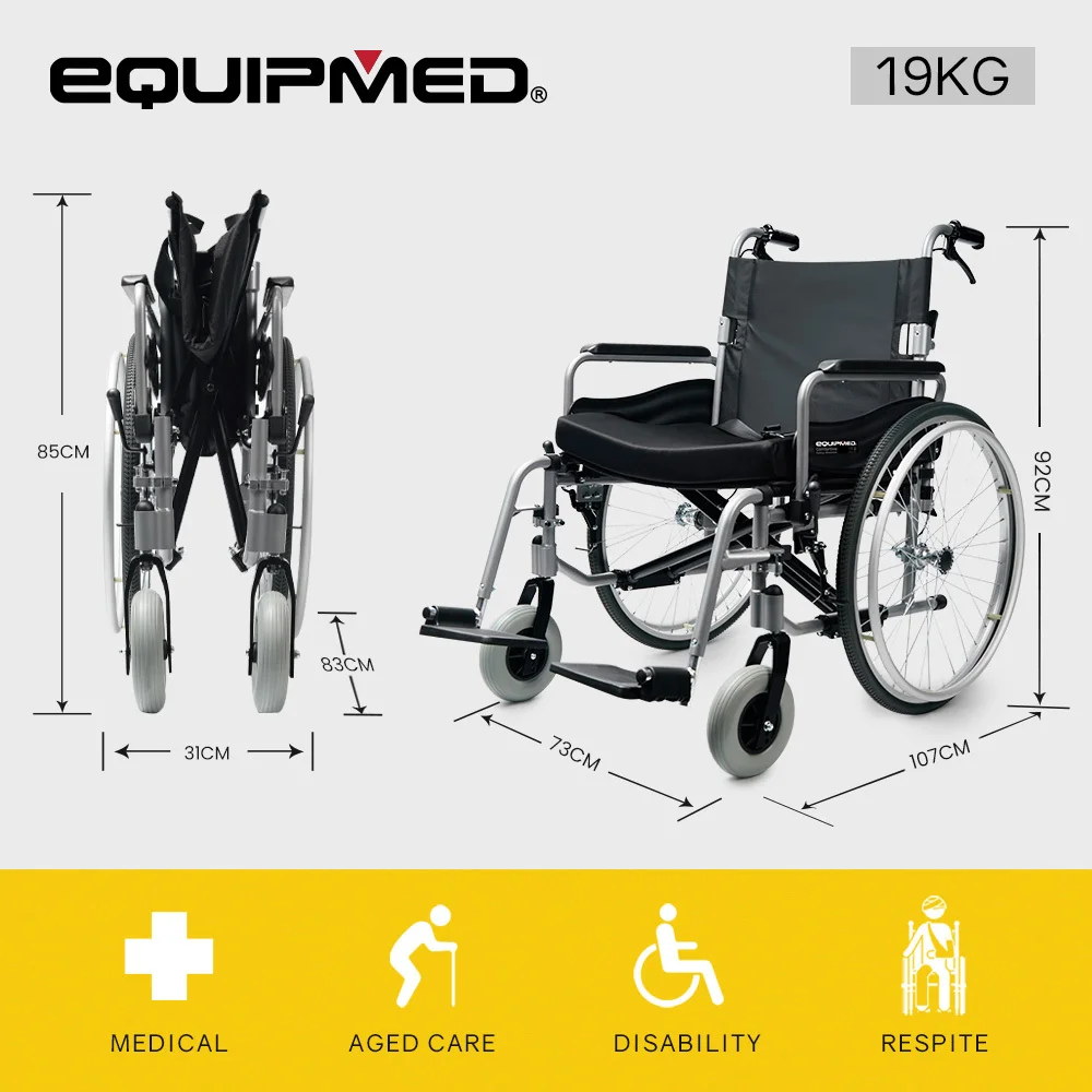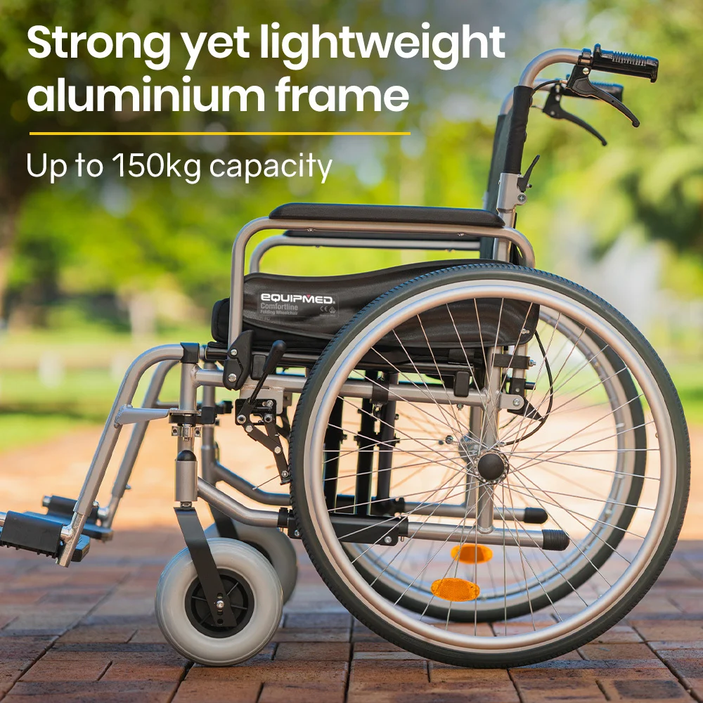 The Equipmed Comfortline series is a premium extra-wide wheelchair. With a powder-coated aluminium design weight is kept to a minimum, yet it is strong enough to accommodate passengers of up to 150kg.