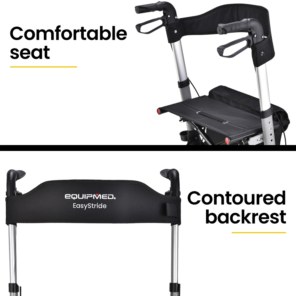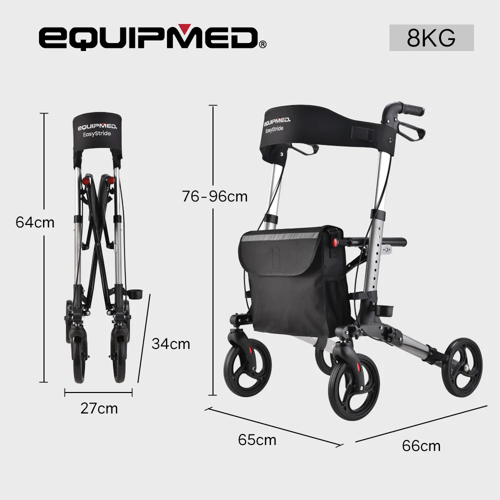 Practicality, reliability, comfort and smooth mobility is required to offer the freedom and confidence that is well deserved - and the Equipmed Easy Stride Rollator ticks all the boxes. Independence is only a step away thanks to the stylish ultra-light 8kg aluminium design with adjustable handle height. The handles themselves feature an ergonomic design and easy-squeeze dual-action brakes. A detachable front carry satchel allows for convenient storage of personal belongings and reading material.