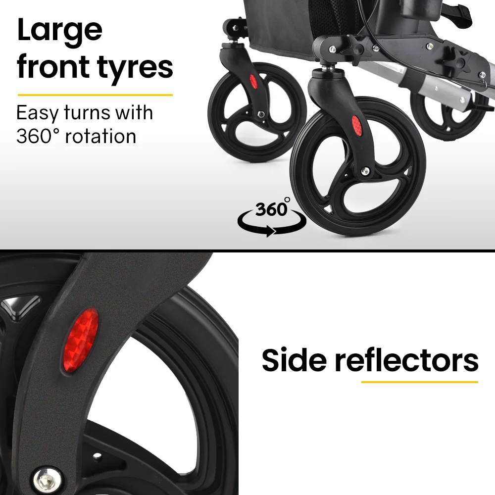 Venture outside on the large 8 wheels which are designed to roll smoothly over the bumps inside and outside, and have reflectors for peace of mind. The comfortable seat with padded back rest comes in handy when youve found a pleasant spot to watch the world go by, or perhaps simply feel like a rest when waiting in line. Simply push the handles down and the walker is locked into place.