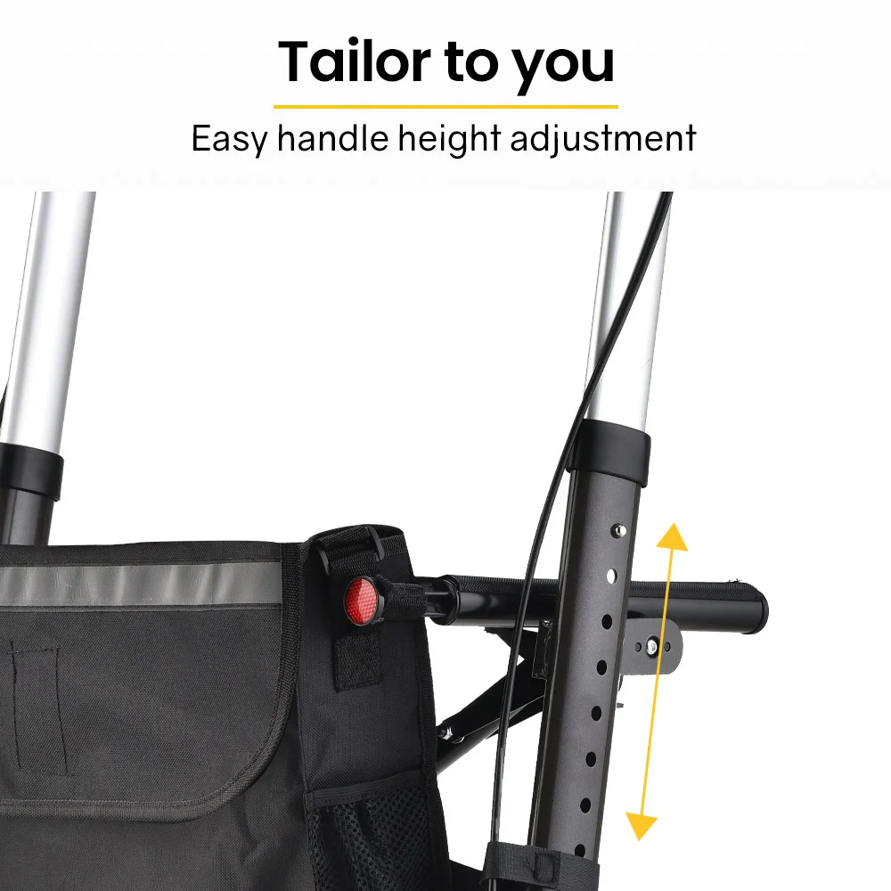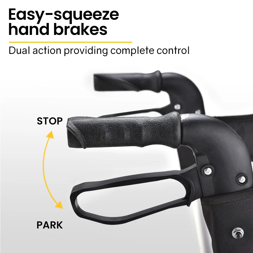 Venture outside on the large 8 wheels which are designed to roll smoothly over the bumps inside and outside, and have reflectors for peace of mind. The comfortable seat with padded back rest comes in handy when youve found a pleasant spot to watch the world go by, or perhaps simply feel like a rest when waiting in line. Simply push the handles down and the walker is locked into place.