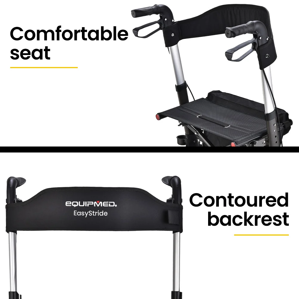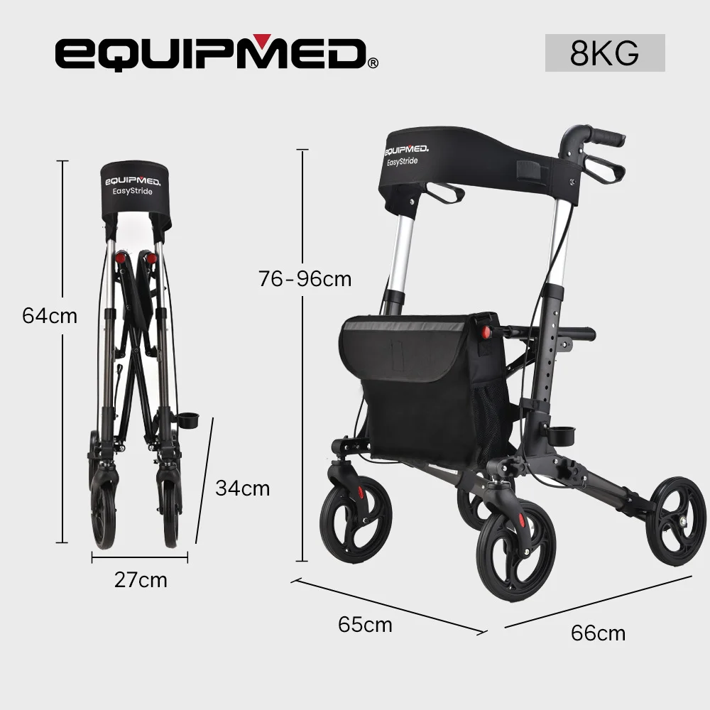 Practicality, reliability, comfort and smooth mobility is required to offer the freedom and confidence that is well deserved - and the Equipmed Easy Stride Rollator ticks all the boxes. Independence is only a step away thanks to the stylish ultra-light 8kg aluminium design with adjustable handle height. The handles themselves feature an ergonomic design and easy-squeeze dual-action brakes. A detachable front carry satchel allows for convenient storage of personal belongings and reading material.
