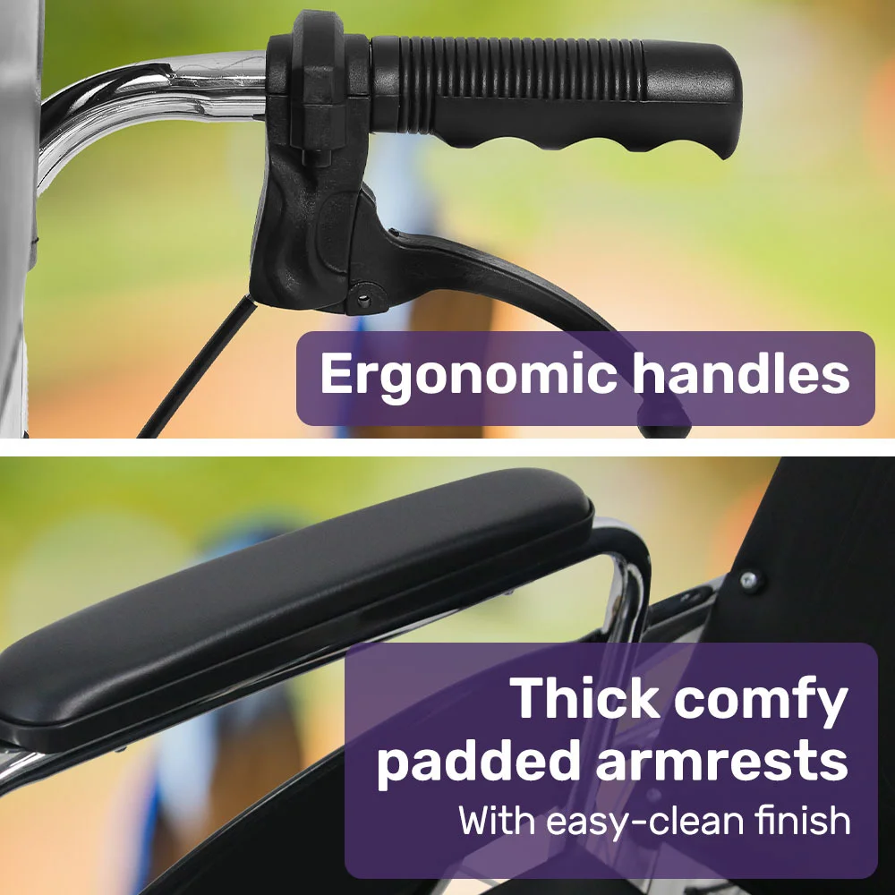 The backrest can be adjusted between 7 angles by a carer using the quick adjust handle levers. The fully reclining action offers several benefits, primarily related to comfort, pressure relief, and improved positioning for individuals who spend extended periods in a wheelchair.