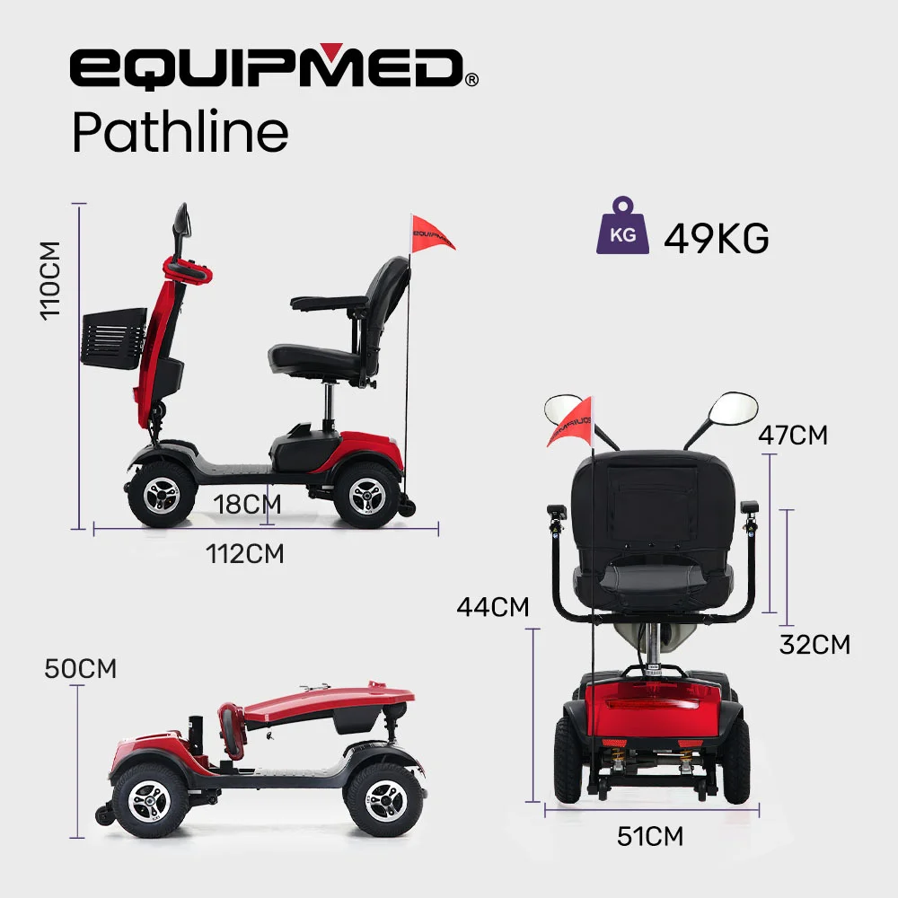Assembly is straightforward with only the seat and armrests needing to be attached. The seat and battery pack are easily removed to make the scooter lighter and more compact in the event that it needs to be transported in a car boot. Occupants of up to 120kg can ride, which is a testament to the sturdy design. If you're seeking a smart solution for your transportation needs, the Equipmed Pathline Series Electric Mobility Scooter will surely fit the bill.
