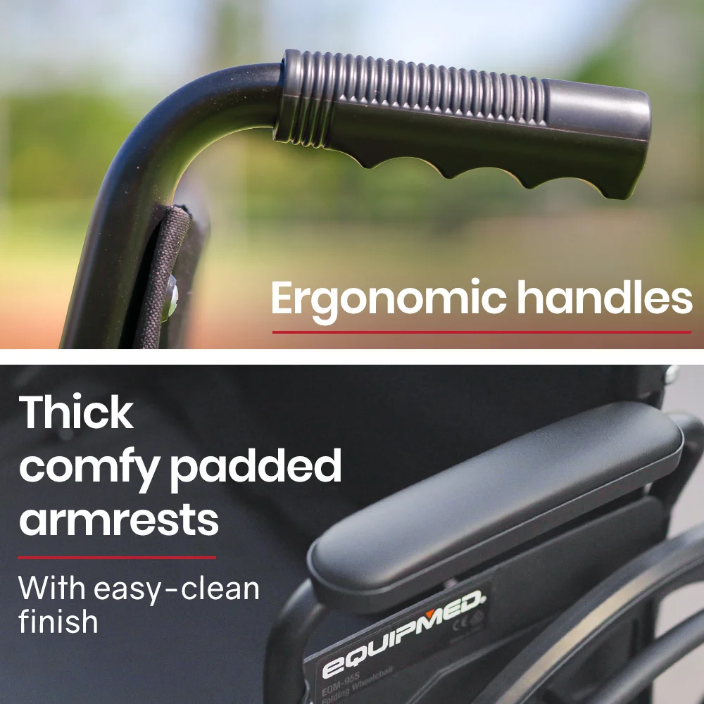 This Equipmed wheel chair features height adjustable footrests that also swing out for easy access onto the wheel chair. Comfy padded armrests and a padded seat with generously proportioned backrest ensure a comfortable ride. The armrests have quick release levers which allow them to swing back to allow for convenient access at tables when dining. And, thanks to the 2 second folding action and ergonomic handles, it makes for a relaxing day out for any helpers, too!