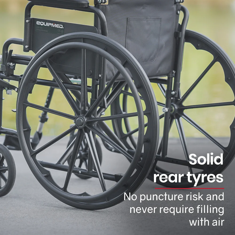 The large 8" front wheels and 24" solid rear tyres roll the wheelchair smoothly over the bumps on a range of surfaces. Not only that, they also offer the practicality of not requiring to be refilled with air and will never experience a puncture!