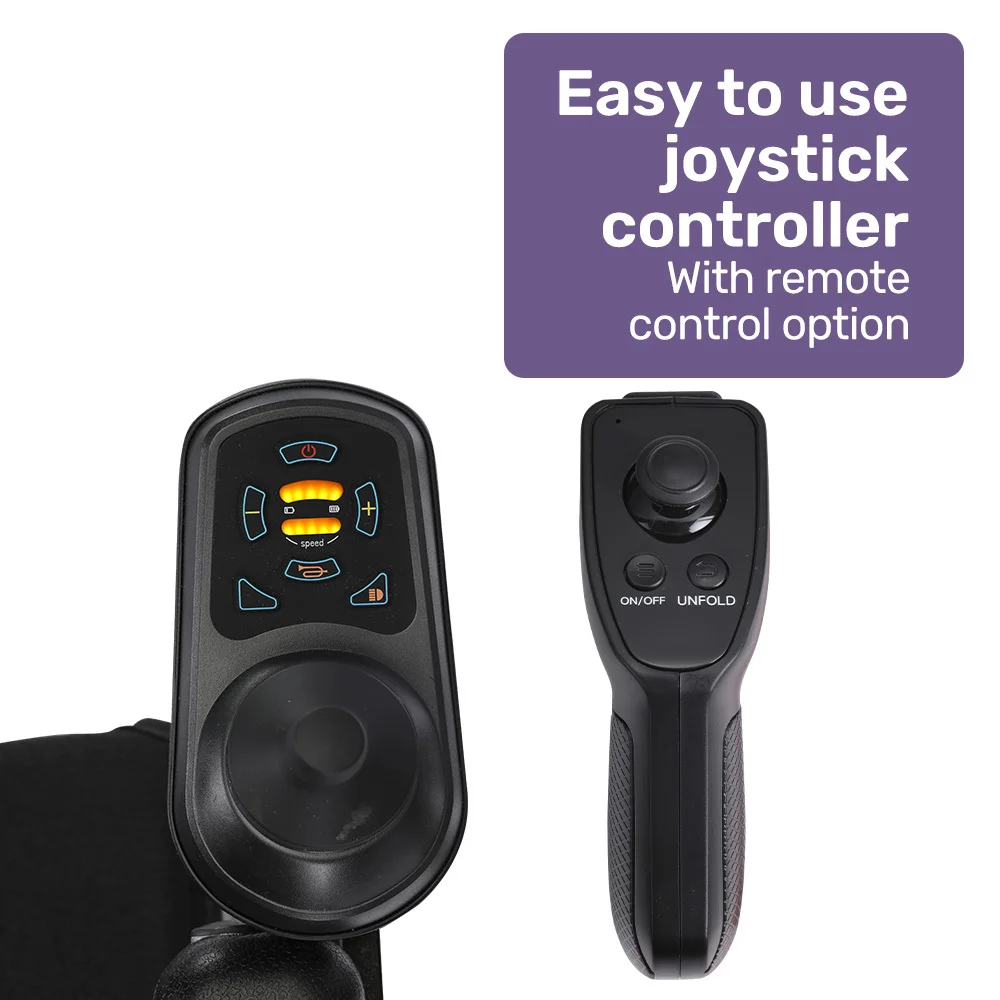 With a premium alloy frame this Equipmed motorised power wheelchair is quick and easy to fold. Easy-to-remove lithium batteries mean that it is as light as possible for loading into a car boot or moving into a space-saving storage position.