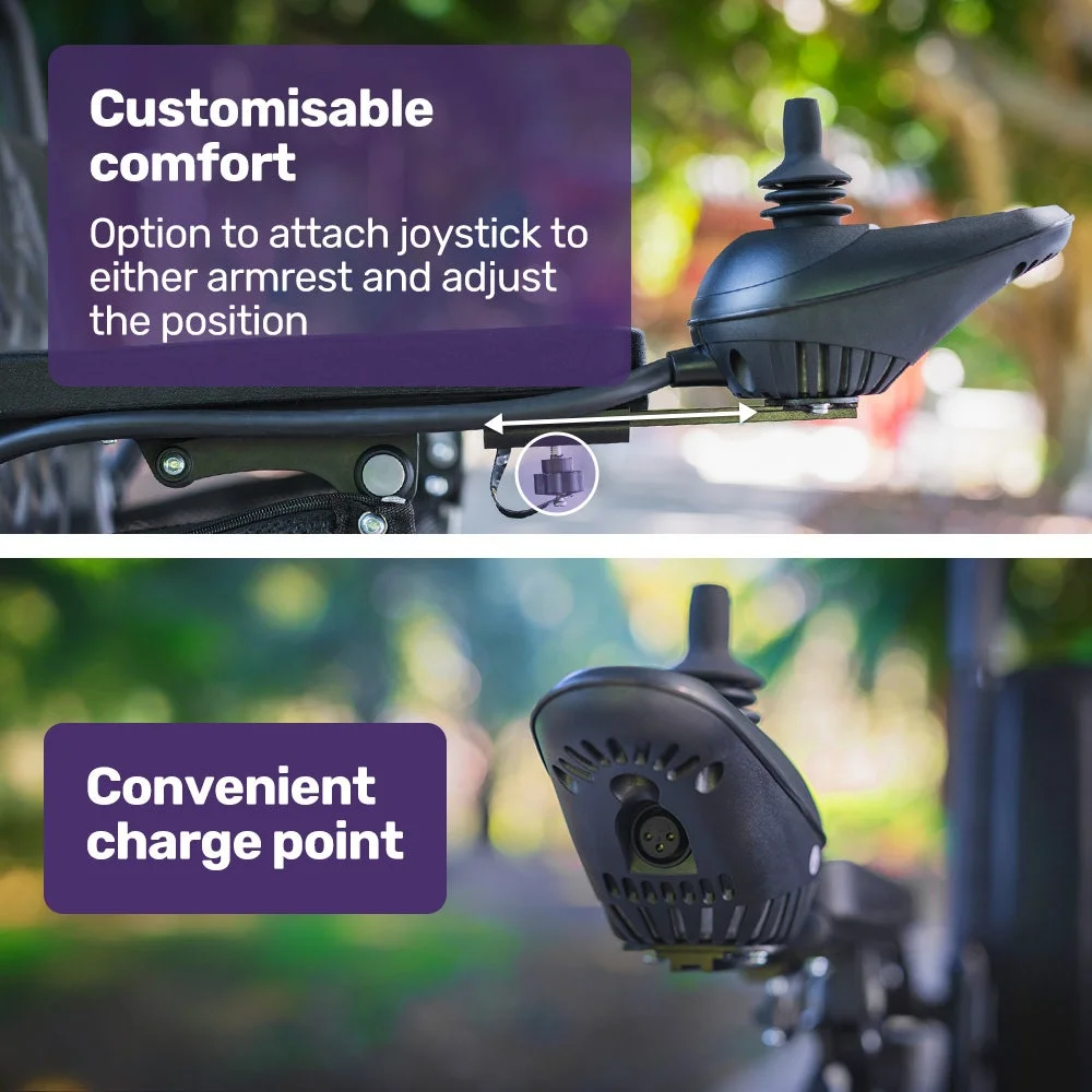 Steering is intuitive using the joystick that can be mounted on either the left or right-hand side, and with easy-to-read LED controls. You can travel along at a sensible speed of up to 6km/h, which is a brisk walking pace.