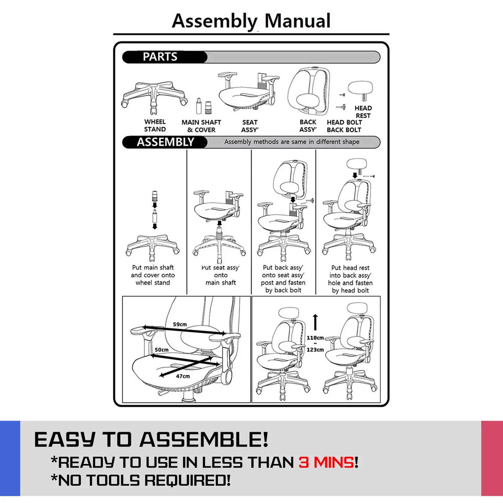If your work requires long hours sitting, you will be amazed by how this chair helps minimise fatigue! It is cleverly designed to help you maintain good posture and also offsets the adverse effects of long hours of sitting. The padded back has a nice texture and is designed to support your back when seated. This model features an extra back and lumbar support which provides more support for the lower back and greatly increases comfort! The height of the chair seat, the backrest and the padded headrest are adjustable so you can adjust the chair to the ideal position which is best suits you! Another great feature is the backrest spring rate can be adjusted and also has a very large angle of tilt sideways. If you need to bend down while sitting to pick up something on the floor or on a drawer, the backrest will hold you up! The setup flexibility is important as we are all different and need different adjustments.