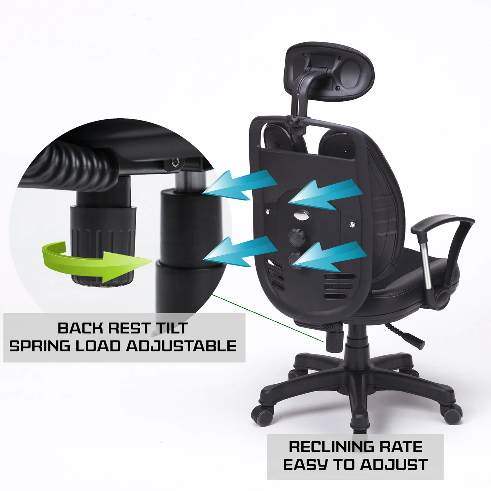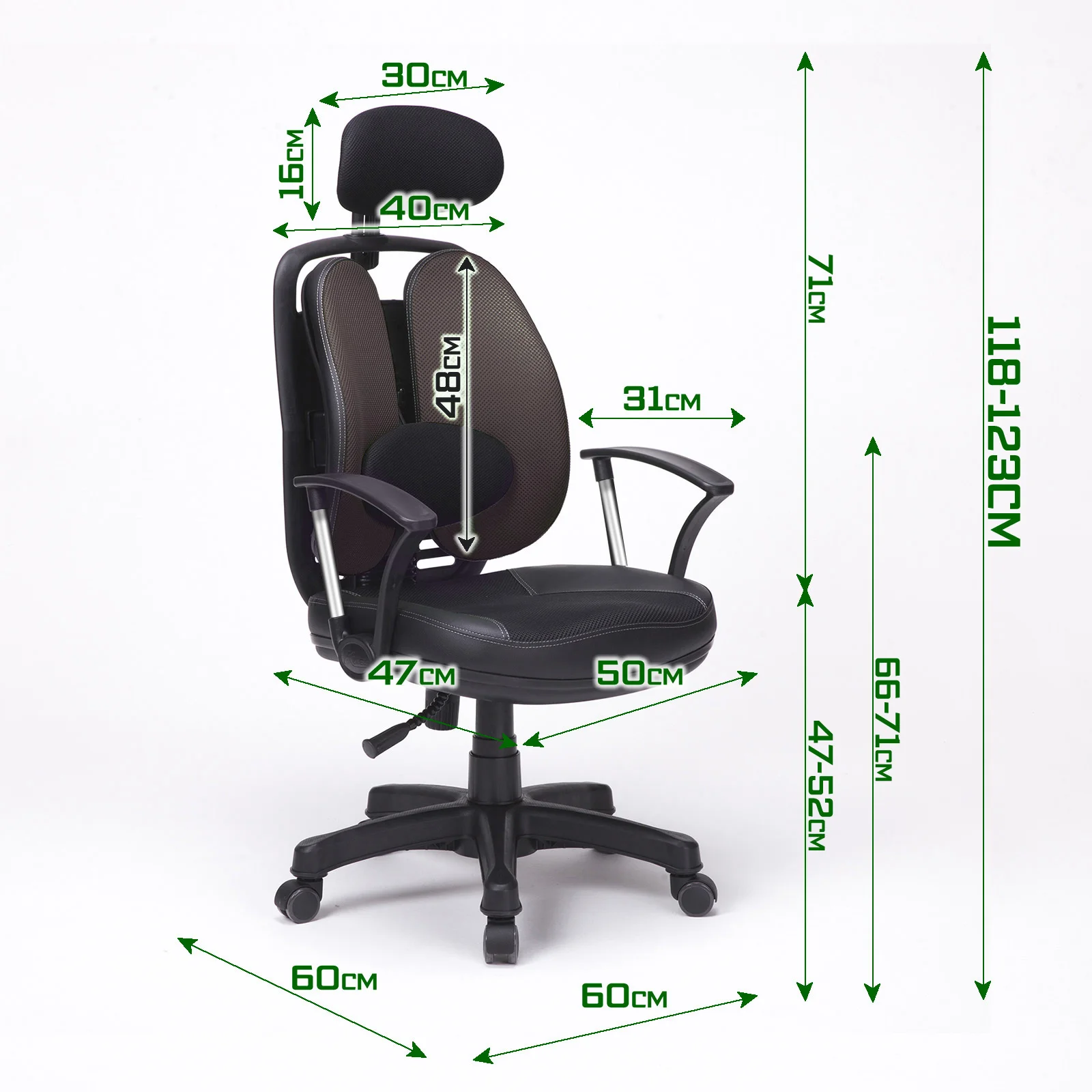 If your work requires long hours sitting, you will be amazed by how this chair helps minimise fatigue! It is cleverly designed to help you maintain good posture and also offsets the adverse effects of long hours of sitting. The padded back has a nice texture and is designed to support your back when seated. This model features an extra back and lumbar support which provides more support for the lower back and greatly increases comfort! The height of the chair seat, the backrest and the padded headrest are adjustable so you can adjust the chair to the ideal position which is best suits you! Another great feature is the backrest spring rate can be adjusted and also has a very large angle of tilt sideways. If you need to bend down while sitting to pick up something on the floor or on a drawer, the backrest will hold you up! The setup flexibility is important as we are all different and need different adjustments.