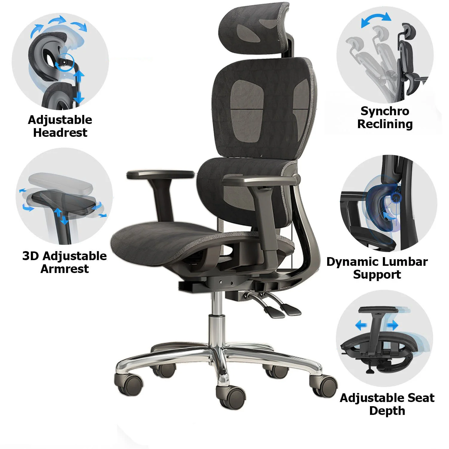 Our office chairs are perfectly designed according to the four curvatures of the human spine. With our ergonomic design based on human body curve and real needs from customers,it is easier to work in comfort by freely adjusting the headrest,lumbar support,armrest,seat depth heigth, as you need to truly make it perfect for a long office day at home!