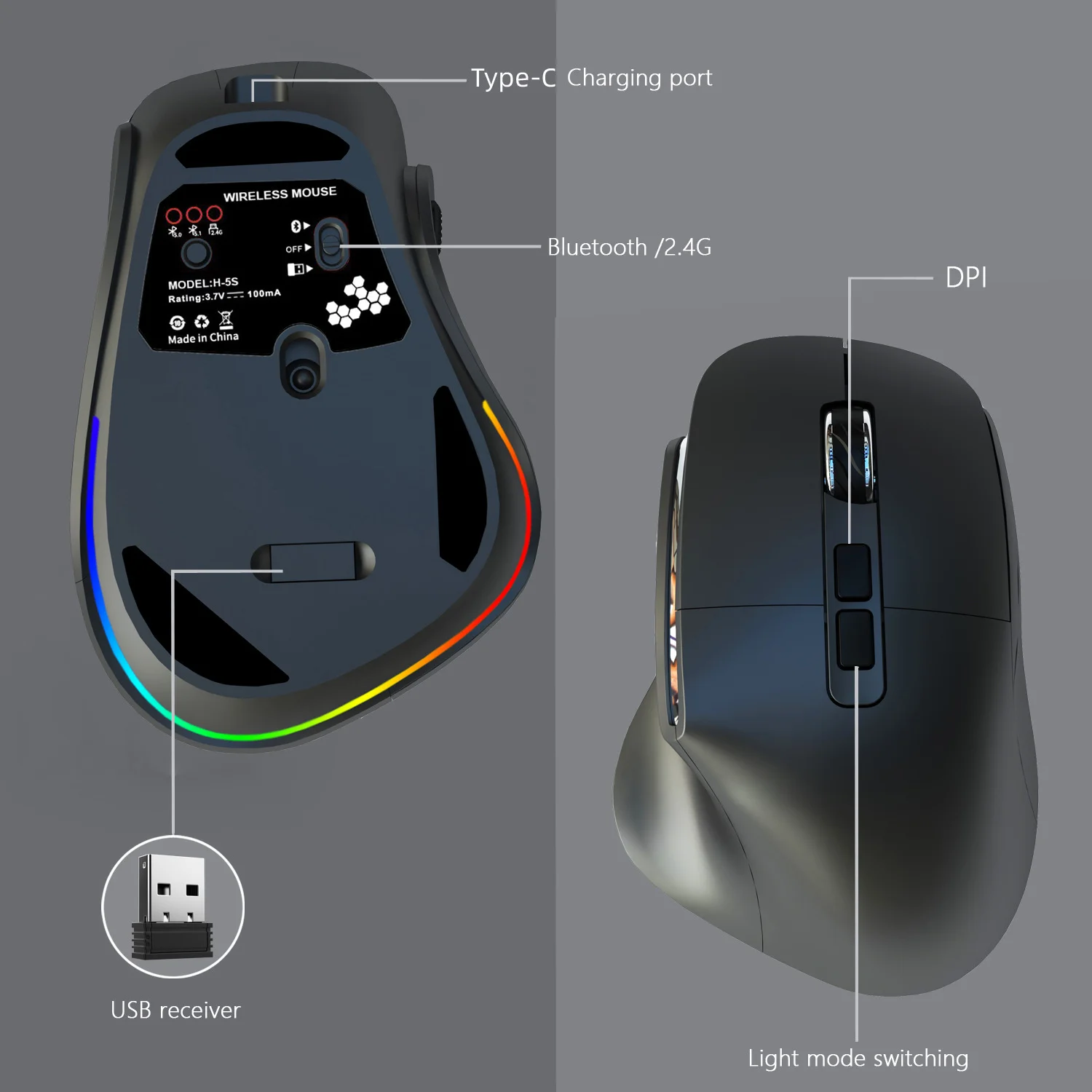 This product contains a lithium battery. Please do not aim the RGB lights directly into eyes for extended periods. Charge the mouse fully before first use. The USB receiver is required for 2.4G wireless mode. Refer to the user manual for pairing instructions for Bluetooth mode and DPI adjustment. Actual battery life may vary depending on usage and RGB lighting settings. Ensure the on/off switch is in the correct position for the desired connection mode.