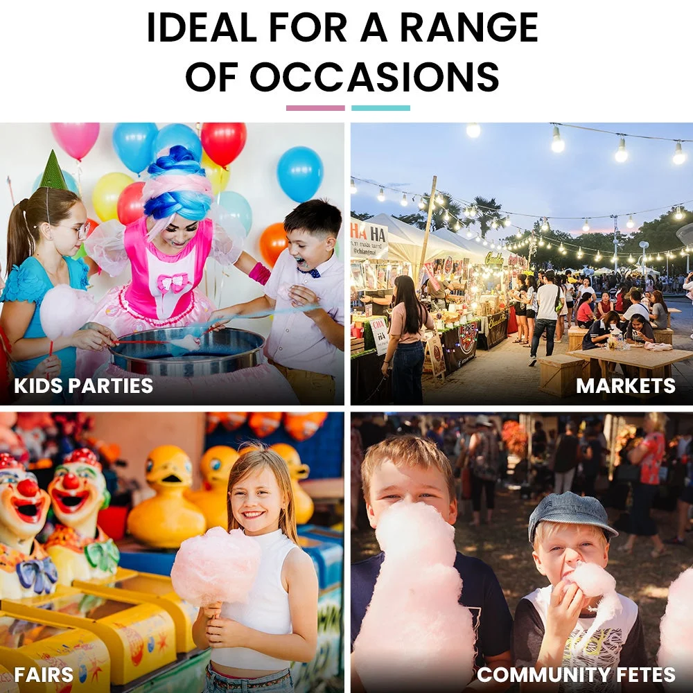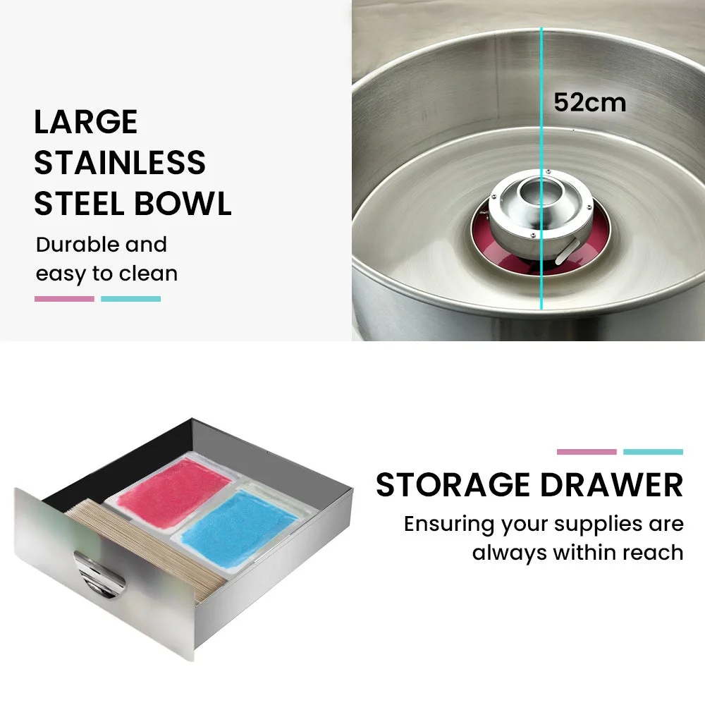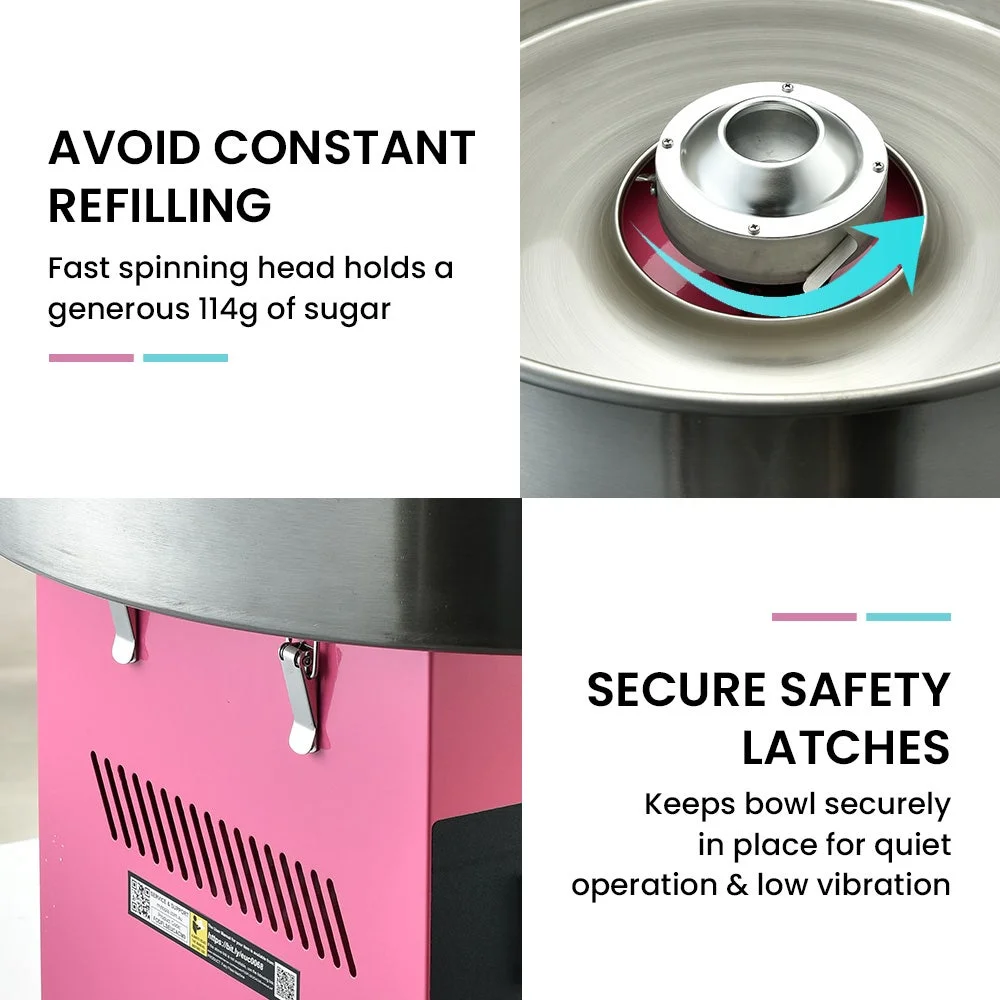 If youre looking for a lucrative and fun way to increase your income then look no further! This commercial-grade machine features a large 52cm diameter stainless steel bowl and is equipped with a powerful and reliable 1100W motor that delivers whisper-quiet operation and produces up to 6 delicious servings of consistently fluffy floss a minute. This versatile machine gives you the option of using traditional floss sugar or transforming any of your favourite hard candies into fluffy fairy floss!