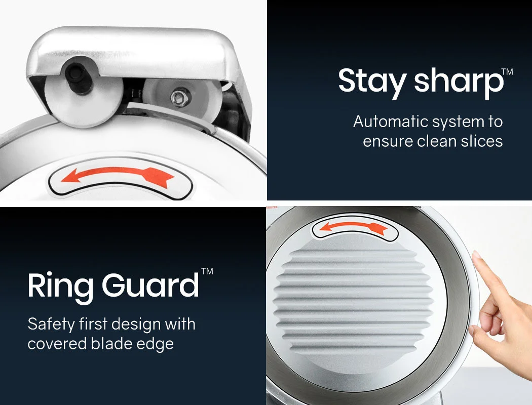 For cutting precision and longevity, this premium appliance features a 8' German stainless steel blade. The EuroChef is also equipped with StaySharp™ - an innovative integrated system that sharpens both sides of the blade with the touch of a button. Efficient output is further assured by its generous 150mm carriage capacity.