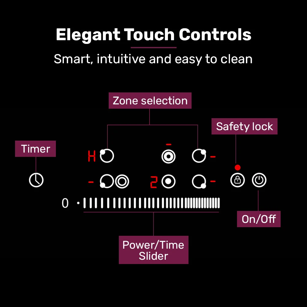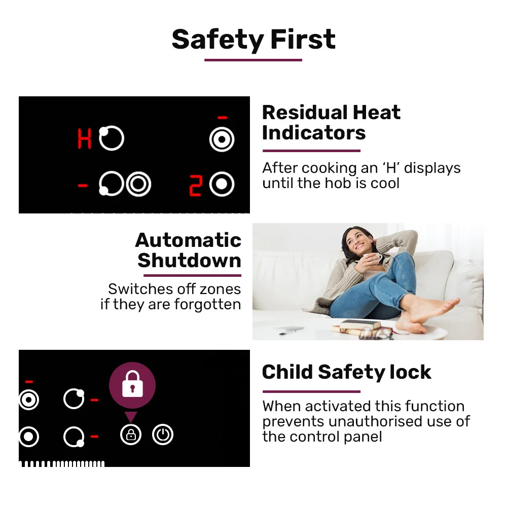 For ease of mind, the EuroChef cooktop has a timer, built-in Child-Lock function, Residual Heat Indicators and an Automatic power off function that switches off the zones if forgotten. And, the Pause function is handy in the event of any unexpected interruptions.