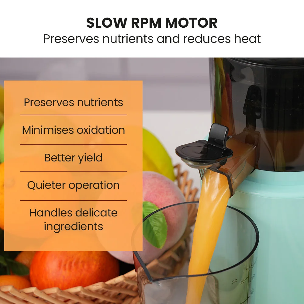 Advanced anti-clog technology, featuring a patented knife system and blade filter, ensures smooth, hassle-free juicing every time. The smart reverse function prevents blockages, and the juicers quiet operation, at under 70dB, makes it ideal for any time of day. With an included pulp container and juice jug, its perfect for small to medium batches.