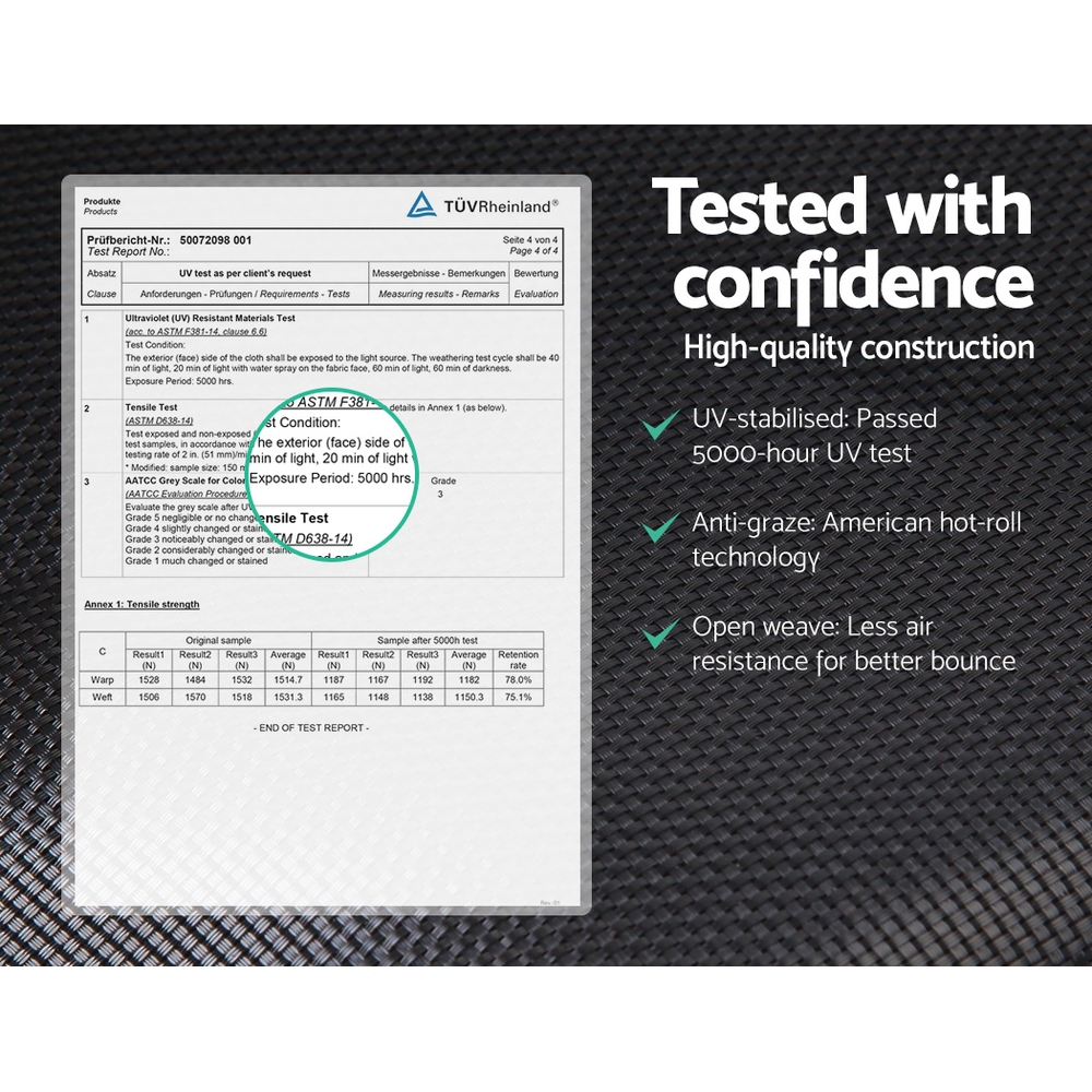 Bounce to your heart’s content with the Trampoline. With its superior bounce characteristics featuring 72-piece triple rate springs, the 12-foot Trampoline enables safe and durable bouncing with no worries. The heavy-gauge steel framework is designed to handle all robust play and is UV-tested for quality and reliability. Other great features include a curve design for more rigidness, 20mm thick padding, anti-graze mat, safety netting and a double-lock zip-and-clip entry. Not least, the included basketball hoop, basketball and pump really adds an awesome fun factor to the entire ensemble. Safety note: Suitable for children aged over 6 years. Features 12ft spacious trampoline Heavy-gauge steel framework Rust-proof marine-grade galvanization Superior bounce and water resistance Anti-graze mat with 5000hrs UV test 20mm thick UV-stabilized padding Wide UV-stabilized spring skirt Triple-rate springs Enclosed safety netting Safe double-lock zip-and-clip entry Bonus storage compartments Bonus basketball set Specifications: Frame: Steel marine-grade hot-dip galvanized Rail padding: High density PVC PE Safety net: Polyethylene Jumping mat: UV-resistant jump mat Safety Posts: High density foam wrapped – ABS capped safety system Ladder: Heavy galvanized steel Max. weight capacity: 150kg Numbers of legs: 4 Numbers of posts: 8 Posts/ Legs/ diameter range: 38*1.2mm thick Frame tube diameter range: 42*1.35mm thick Numbers of springs: 72 Spring length: 143mm Trampoline diameter: 12ft/366cm Overall height: 260cm Height to mat: 80cm Net height: 180cm Number of package boxes: 2 Assembly required: Yes Package Content 1 x 12ft Trampoline 1 x Ladder 1 x Storage compartment 1 x Basketball set 1 x Ball pump 1 x Assembly manual