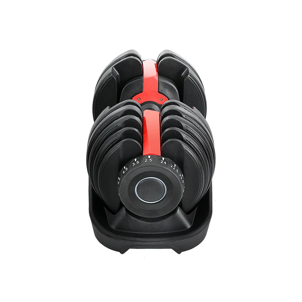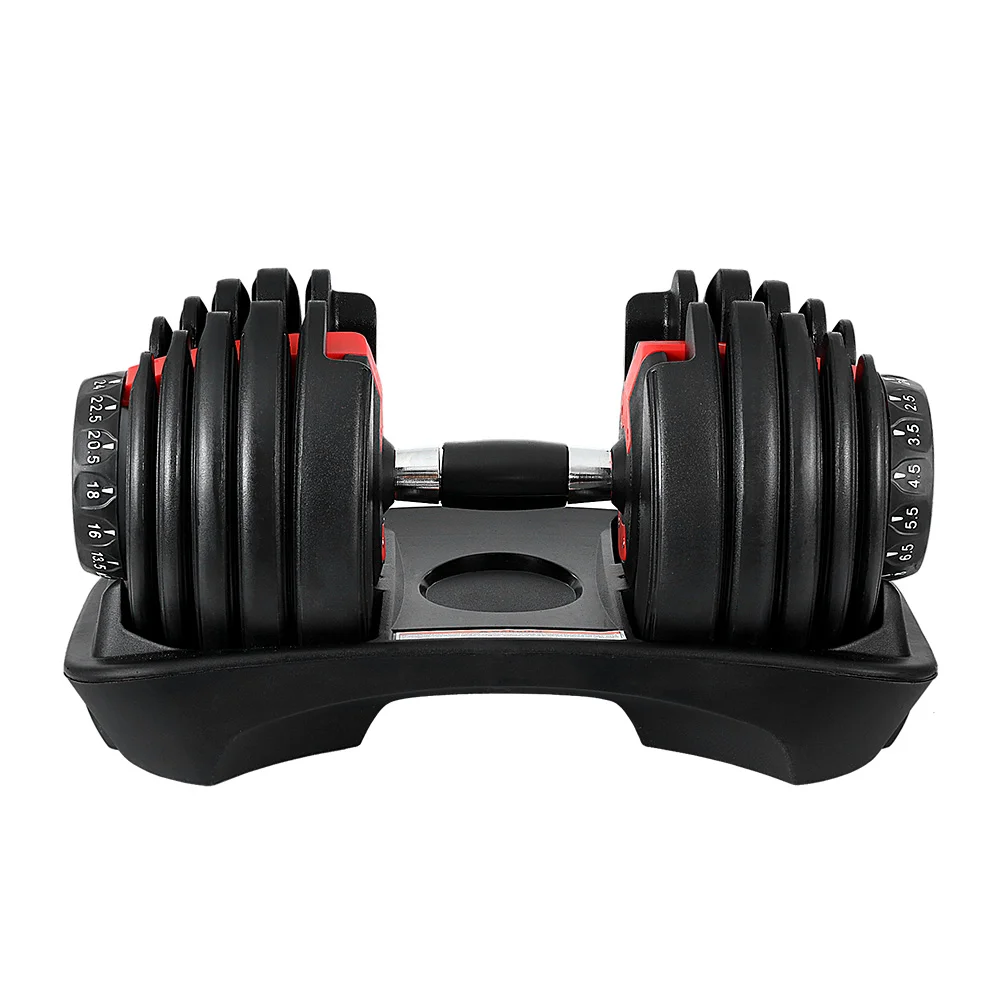 Time to get tough. If you are looking to boost those triceps, biceps and shoulders, our Adjustable Dumbbell is the perfect deal for you. Whatever your game is, our dumbbell set lets you strengthen and tone those muscles your way. This commercial-grade set features a high-quality bar with non-slip handle that offers optimal gripping surface. The innovative design allows for 15 combinations of quality incremental weights from 2.5kg to 24kg, to suit your workout requirements. The 10 plastic-coated iron weight plates sit in the dumbbell holder. You can just press down the high-quality steel dumbbell bar onto the weight plates and rotate the weight adjustment dial for the right plates to lock into place. The high-quality star-shaped nuts ensure the weight plates stay securely in place for safe workouts. Gym junkie or workout pro, you can get fit easily with our Adjustable Dumbbell.