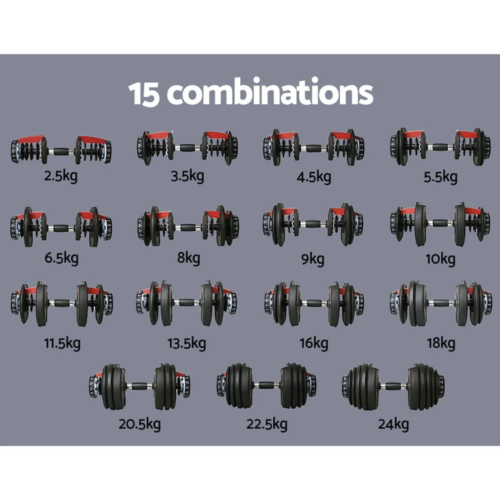 Time to get tough. If you are looking to boost those triceps, biceps and shoulders, our Adjustable Dumbbell is the perfect deal for you. Whatever your game is, our dumbbell set lets you strengthen and tone those muscles your way. This commercial-grade set features a high-quality bar with non-slip handle that offers optimal gripping surface. The innovative design allows for 15 combinations of quality incremental weights from 2.5kg to 24kg, to suit your workout requirements. The 10 plastic-coated iron weight plates sit in the dumbbell holder. You can just press down the high-quality steel dumbbell bar onto the weight plates and rotate the weight adjustment dial for the right plates to lock into place. The high-quality star-shaped nuts ensure the weight plates stay securely in place for safe workouts. Gym junkie or workout pro, you can get fit easily with our Adjustable Dumbbell.