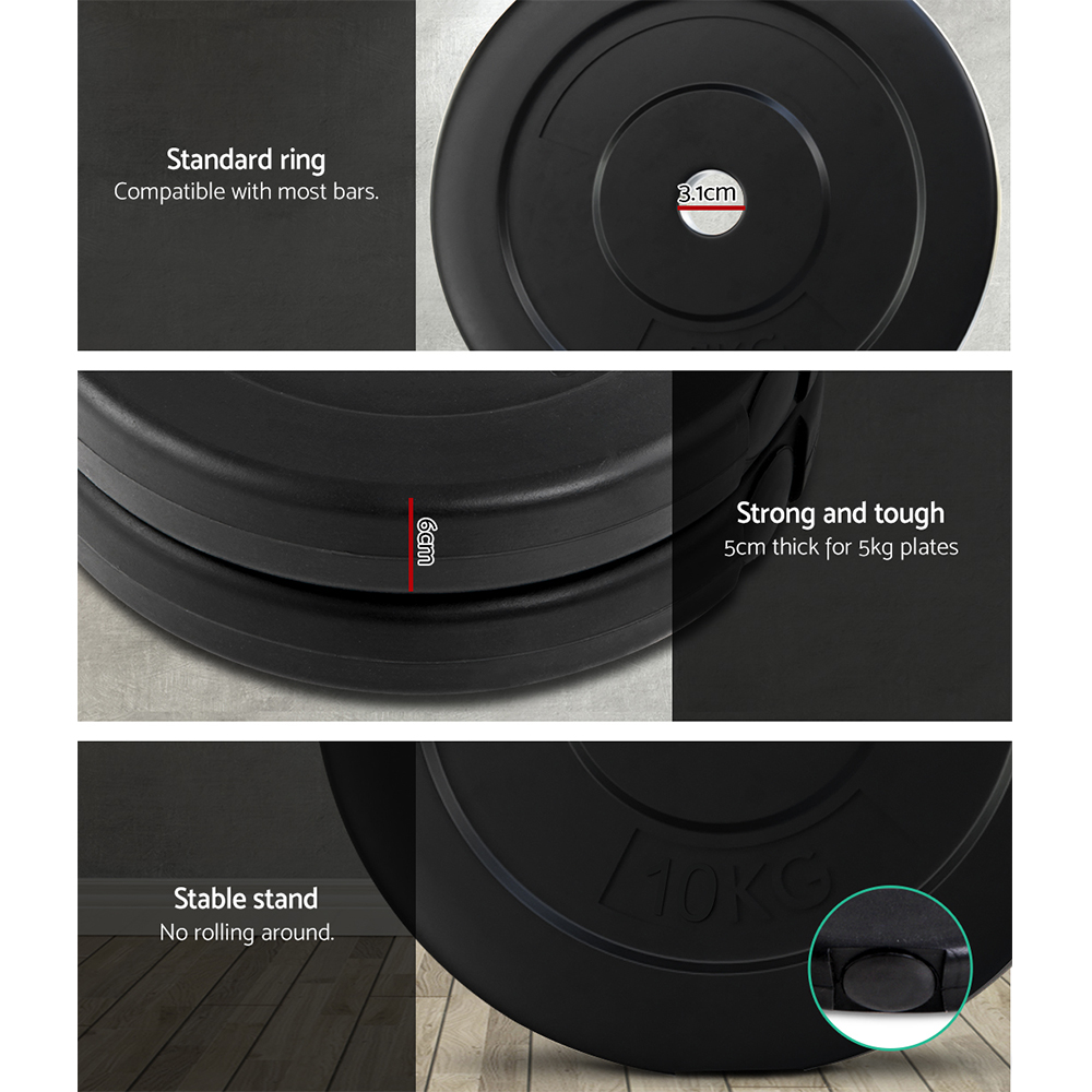 Made of strong materials, these Home Gym Weight Plates will allow you strengthen and tone your muscles at home with ease. These weight plates are filled with sand and covered with robust, floor-friendly rubber to minimize noise and floor damage. Easily add and remove plates to ensure an appropriate workout for your specific muscles. Plus, the included solid chrome plated steel Barbell Bar, holds up to 150kg and is compatible with most standard 31mm – 35mm hole weight plates, so you can work at any weight. Choose from the fitness range that is both good for your body and good for your wallet. Features Commercial grade, ideal for professional body workout High quality plates Standard 31mm hole diameter weight plates Detachable barbell bar for easy storage Comes with 2 spring lock Ideal for full body workouts, muscle gain and weight management Specifications: Weight Plates Material: Rubber surface, Cast cement Barbell bar weight: 8kg Number of plates: 10kg x 8pcs Aperture: 31mm Barbell Bar Length: 168cm Barbell Bar Material: Steel Barbell Bar Weight Capacity: 150kg Assembly required: Yes Number of packages: 5 Package Content 8 x 10KG weight plates 1 x Barball bar