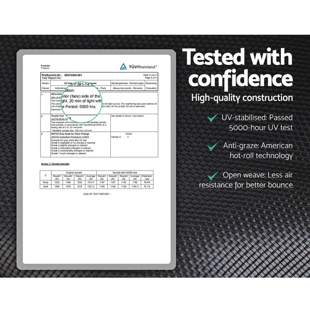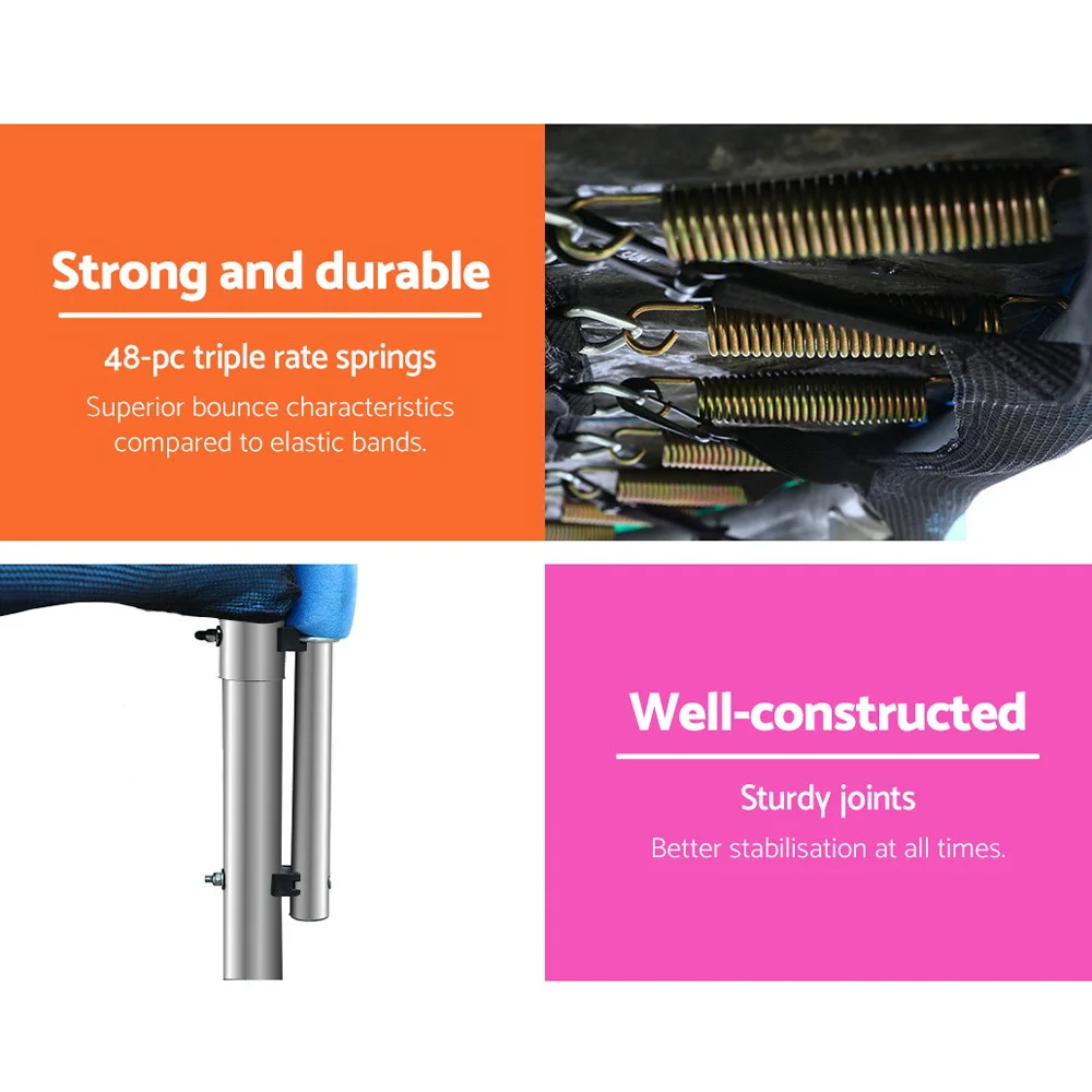 Bounce to your heart's content with our Trampoline. With its superior bounce characteristics featuring 48-piece triple rate springs, the 8-foot trampoline enables safe and durable bouncing with no worries. The heavy-gauge steel framework is designed to handle all robust play and is UV-tested for quality and reliability. Other great features include 6 posts for strong support, 20mm thick padding, anti-graze mat, safety netting and a double-lock zip-and-clip entry. So jump to it and order our trampoline today.