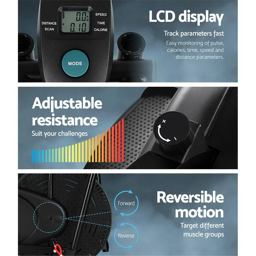 Elliptical cross trainers are excellent fitness machines for individuals who demand a training regime that works on all muscles and yet eliminates the risk of impact injuries such as treadmill running or walking. Hence the trainers are particularly helpful for those with joint problems with knees and feet. Our Everfit Elliptical Bike is a very efficient low-impact cross trainer that offers adjustable mechanical resistance to tone every muscle in your body. The easy-to-read LCD display lets you keep track of your training parameters. The industrial-strength powder-coated steel frame is strong and sturdy and the large seat is comfortable with every stride. Other great features include rubber-clad pole grips, reversible two-way movement, mode changes within 30 seconds and adjustable handlebar height and seat. Not least, the elliptical bike allows you to exercise whenever you want, anytime and anywhere.