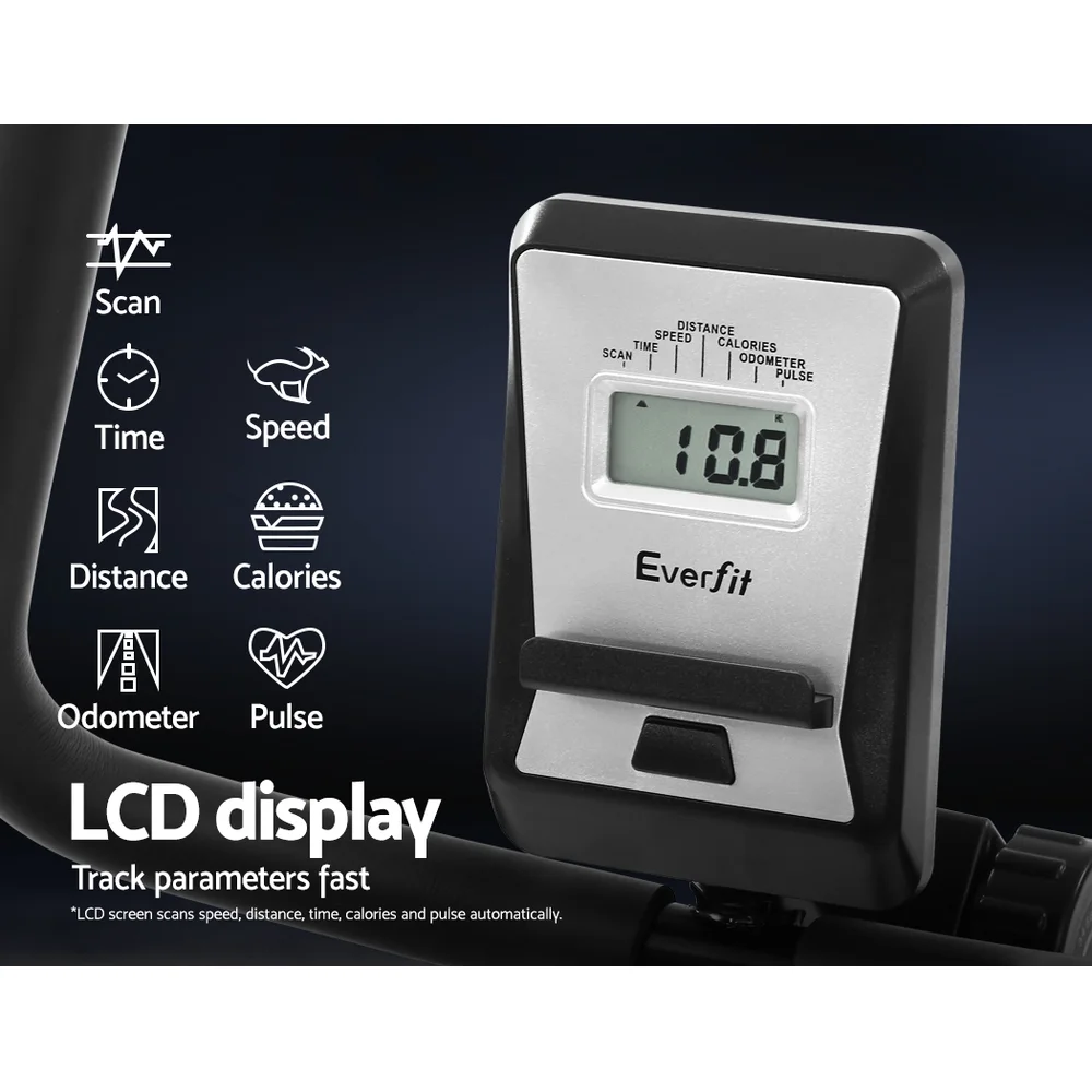 Get an effective workout in the comfort of your home while watching TV or listening to your favourite music. Our Everfit Recumbent Exercise Bike is just perfect to have all these at once. Designed for people who prefer a low or non-impact exercise regimen, our recumbent bike provides adequate exercise for the body without causing undue stress and strains on your joints and back. The relaxed seating position actually allows you to balance your body weight better and get your legs and heart to work together in tandem for better blood flow. The LCD display also helps to track parameters easily to let you monitor your health while exercising. The bike itself is constructed of an industrial-strength power-coated steel frame for durability and rust resistance. With up to eight resistance levels, the bike can be adjusted for the desired exercising intensity to suit your workout. Plus, the magnetic flywheel is smooth and runs almost friction-free. Other features include an adjustable seat length, wide and comfortable seat and non-slip protective feet. Not least, the recumbent bike is also easy to transport with two handy wheels for hassle-free moving.