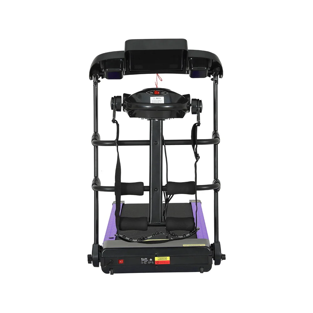For a truly effective approach to weight loss and toning, our Everfit Fitness Treadmill is your perfect companion. Compact and sturdy with its powder-coated steel frame, the treadmill allows you to perform essential cardio exercises within the comfort of your home. The treadmill features 12 pre-set training programs designed to simulate natural terrain. A user-centric control panel with a digital LCD display lets you set up speeds of between 1km/h and 14km/h and monitor other parameters. Its powerful and energy-efficient motor produces smooth and seamless operation and the anti-slip belt and soft-grip handlebar make your session a comfortable and controlled experience. The belt is self-lubricating for a smooth run every time. When all the hard work is done, fold and store away the compact treadmill easily. Other great features include a safety tether key, dual drink holders, smooth wheels for easy mobility, a massage bar, a sit-up bar and a tablet holder. For health results that matter, our fitness treadmill is the one to run to.