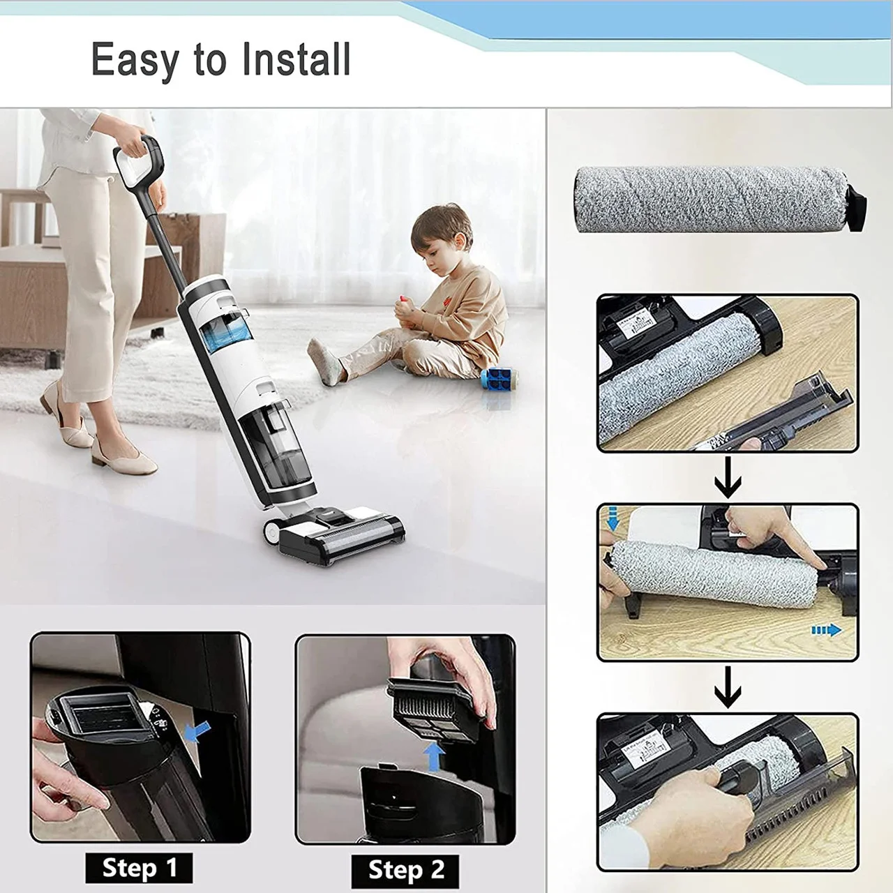 Roller brush: Soft roller brush with bristles for vacuuming and washing the floor simultaneously.