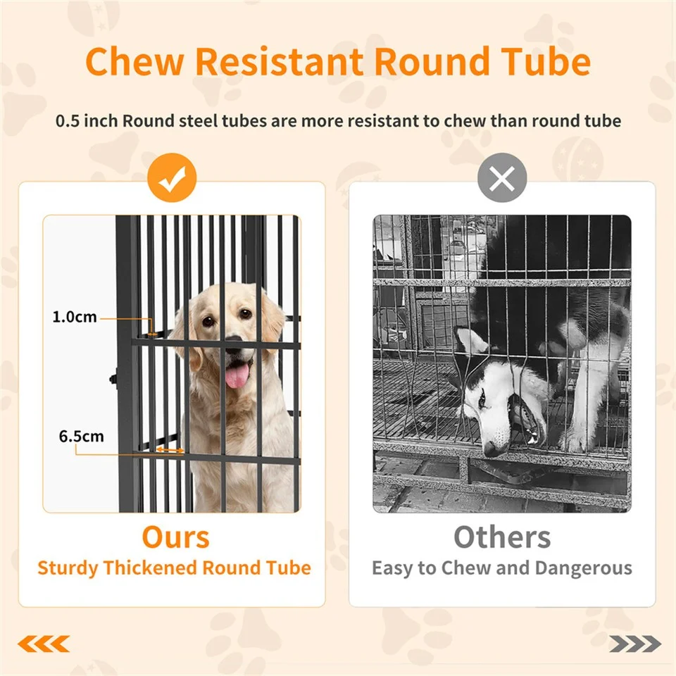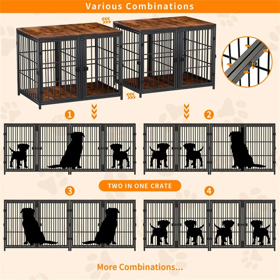 Heavy Dog Crate Structure: crate is constructed from thick heavy metal material with high strength, not easy to rust, deform and destroy, rounded iron tubes design are more resistant to bite than thin wires, boasting a solid MDF board table top with beautiful wood grain, easy to clean, great for holding any decorations on or dog necessities storage