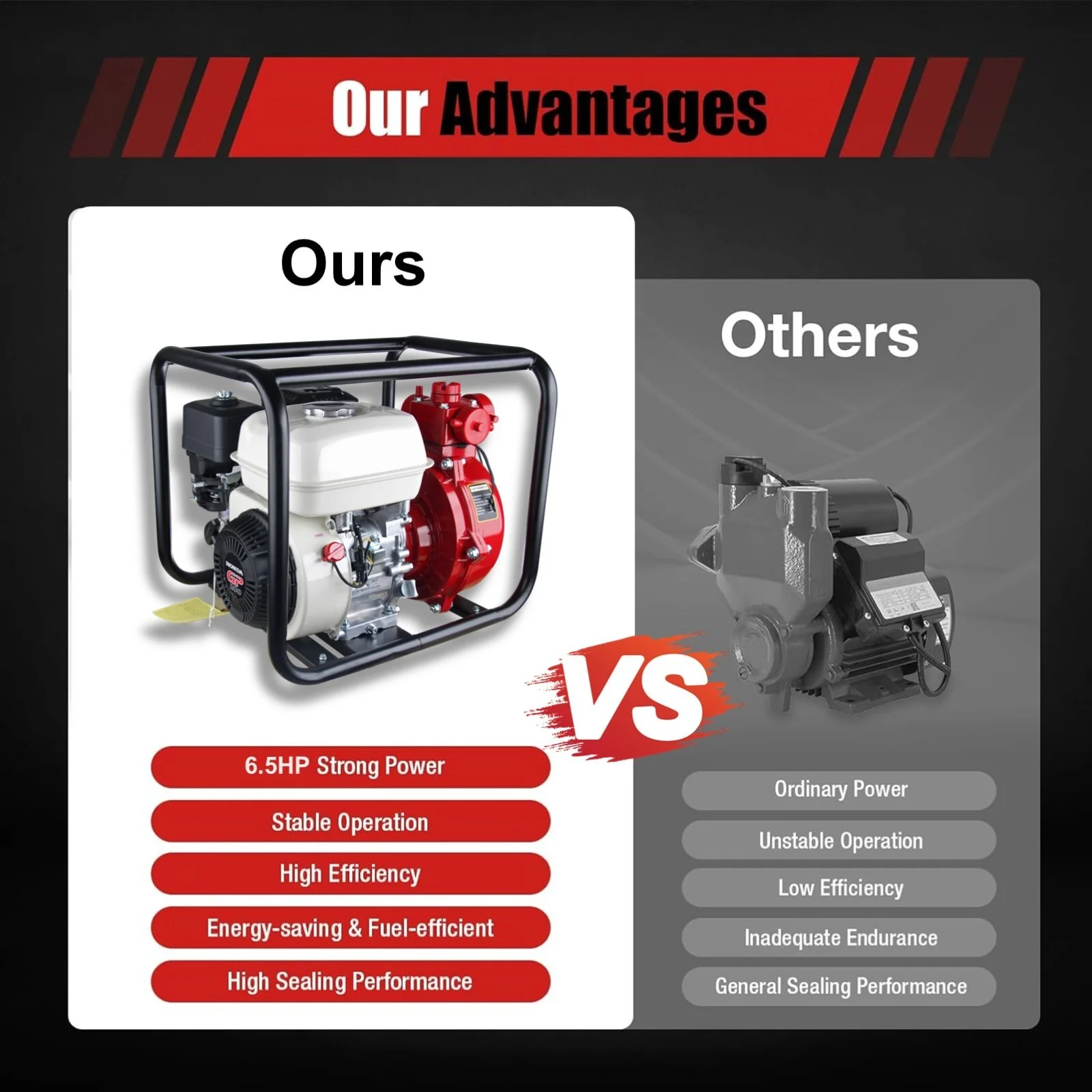 The 4-stroke design of the water pump's engine guarantees maximum fuel economy and consistent power output. Experience a seamless and efficient pumping process that maximizes fuel efficiency and provides the power required for a variety of applications.