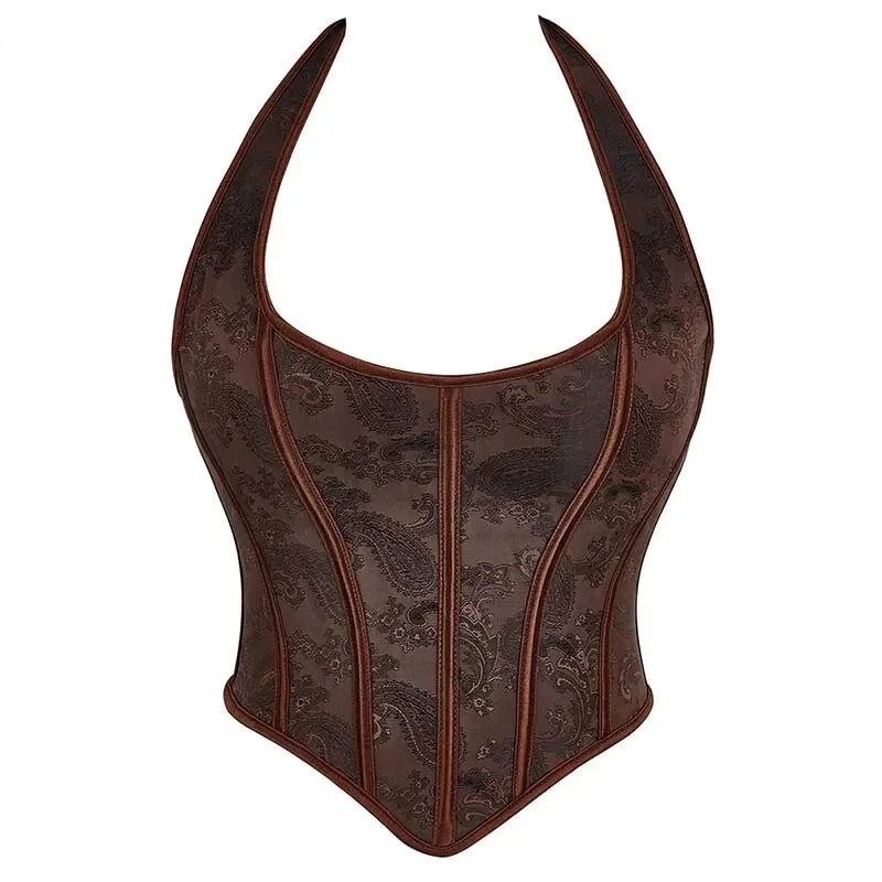 Brown Steampunk Corset With Front Busk Closure Floral Lace And Puff Sleeves - Green - S