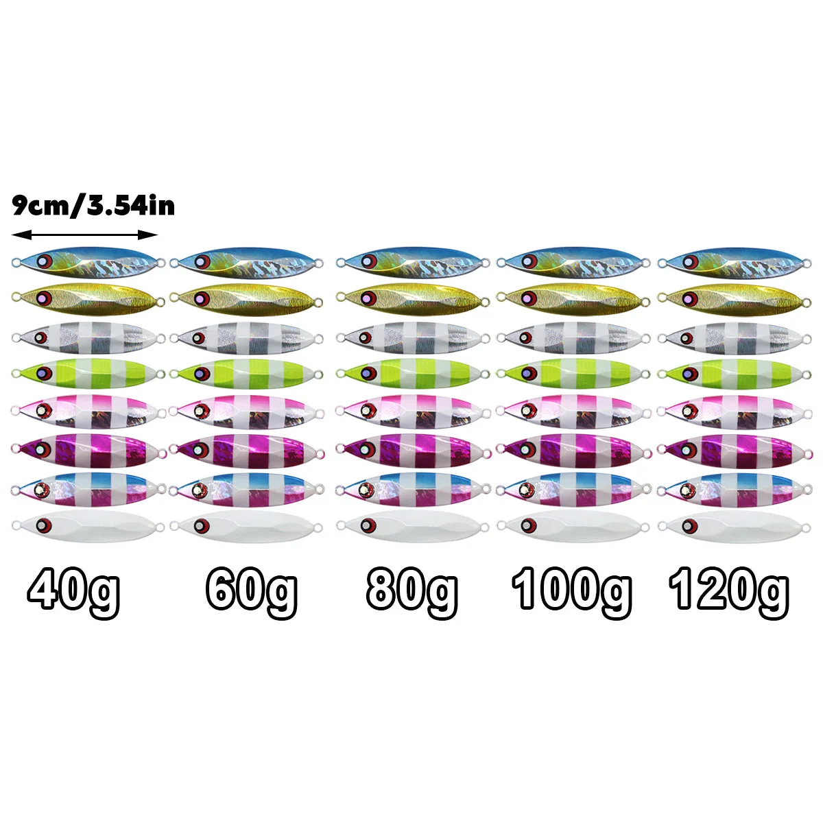 Upgrade your saltwater fishing kit with this set of 8 metal lures, designed for deep sea and offshore casting. Each tapered lure features a balanced weight profile and glow-in-the-dark coating, making them ideal for attracting predatory fish in low-light or deepwater environments. Built from durable iron plates with vibrant finishes, these lures mimic real baitfish to trigger aggressive strikes and withstand repeated use.