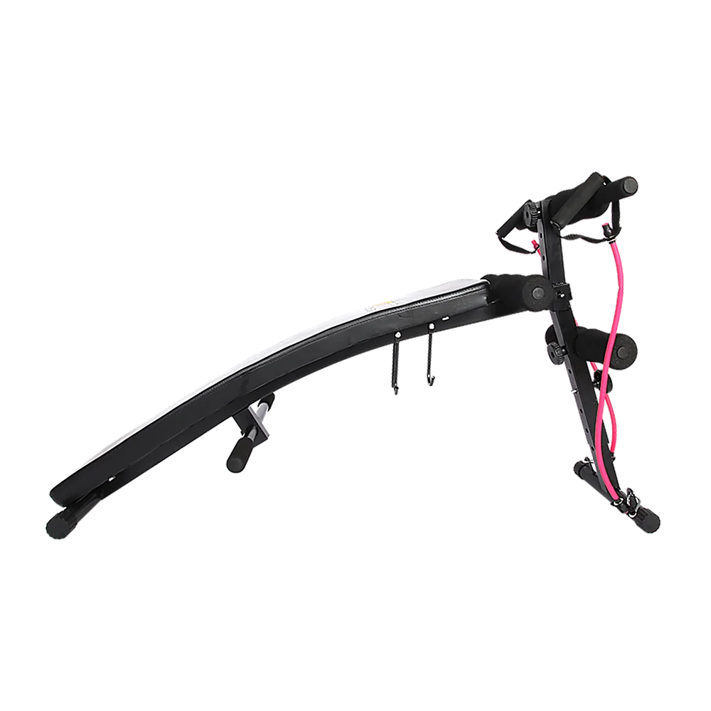 The incline sit-up bench is curved to ensure an intense core and upper body workout. The two 1.5kg dumbbells and pair of rubber cord resistance expanders will bring new strength and tone to your muscles. This must-have sit-up bench adjusts for height to enable maximum intensity and features adjustable knee, leg and foot foam roller bars to accommodate all body sizes.