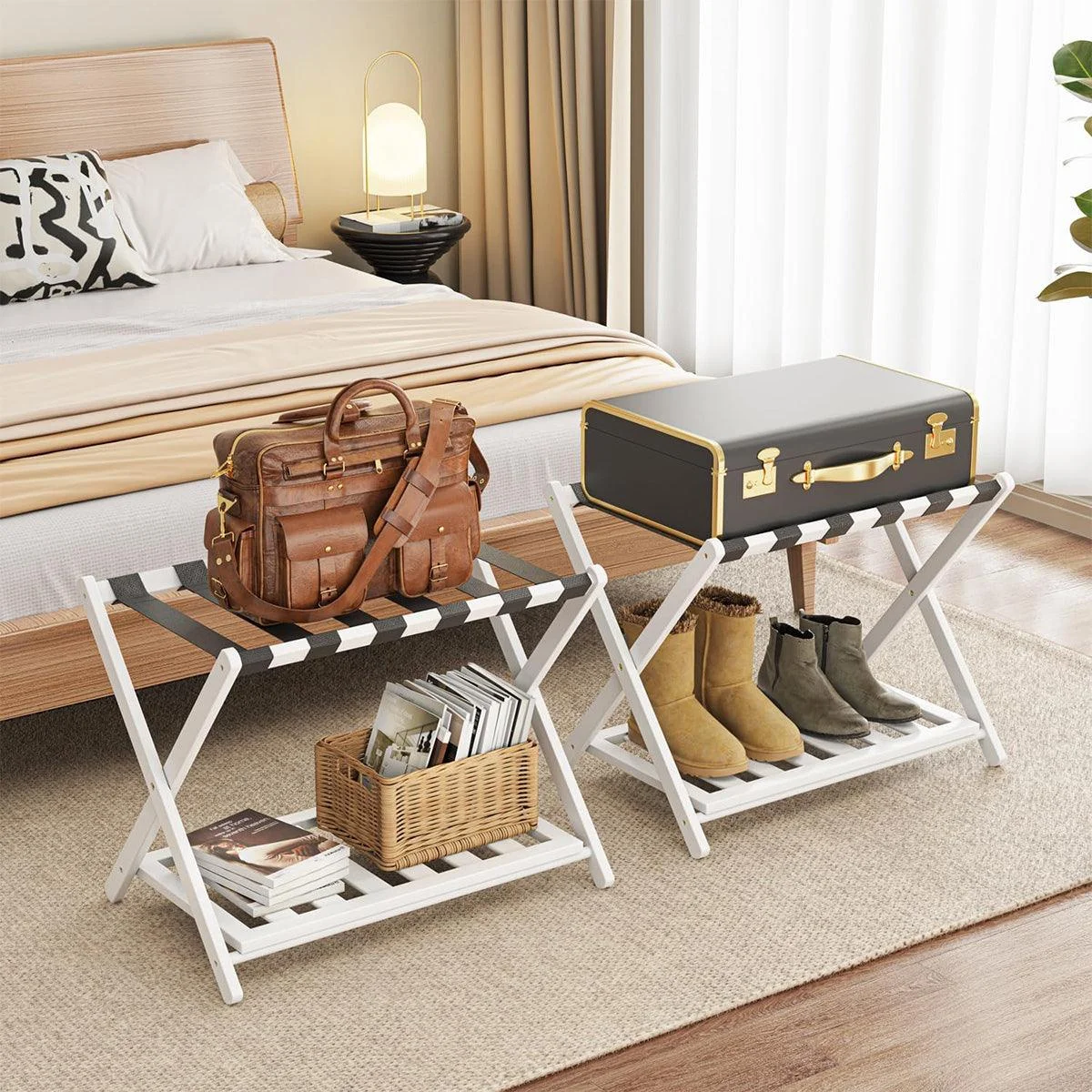 This foldable luggage rack offers a practical solution for organising suitcases and storage in bedrooms, guest rooms, or hotels. Made from thickened bamboo with a sturdy X-shaped structure, it supports various luggage sizes with ease. The bottom shelf provides extra space for shoes or bags, while its foldable design allows for easy storage when not in use. Simple, elegant, and highly functional.
