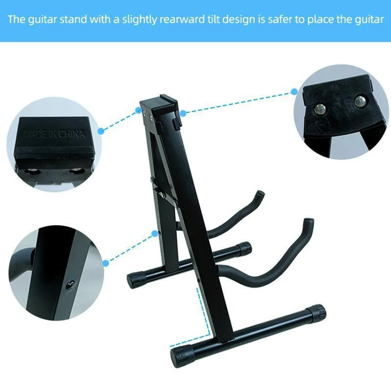 This foldable guitar stand offers a practical and space-saving solution for safely storing your acoustic, classical, or electric guitar. Built with a strong iron A-frame, it is lightweight yet stable, ideal for both home use and stage performance. The support arms that cradle the guitar body are wrapped in soft foam padding to prevent scratches, while the A-frame top features a rubber buffer to protect the guitar neck from scuffing. The wide base and angled design ensure better weight distribution, making the stand less prone to tipping. Thanks to its quick-fold hinge, this guitar stand can be folded flat for easy storage or transport—perfect for musicians on the go.