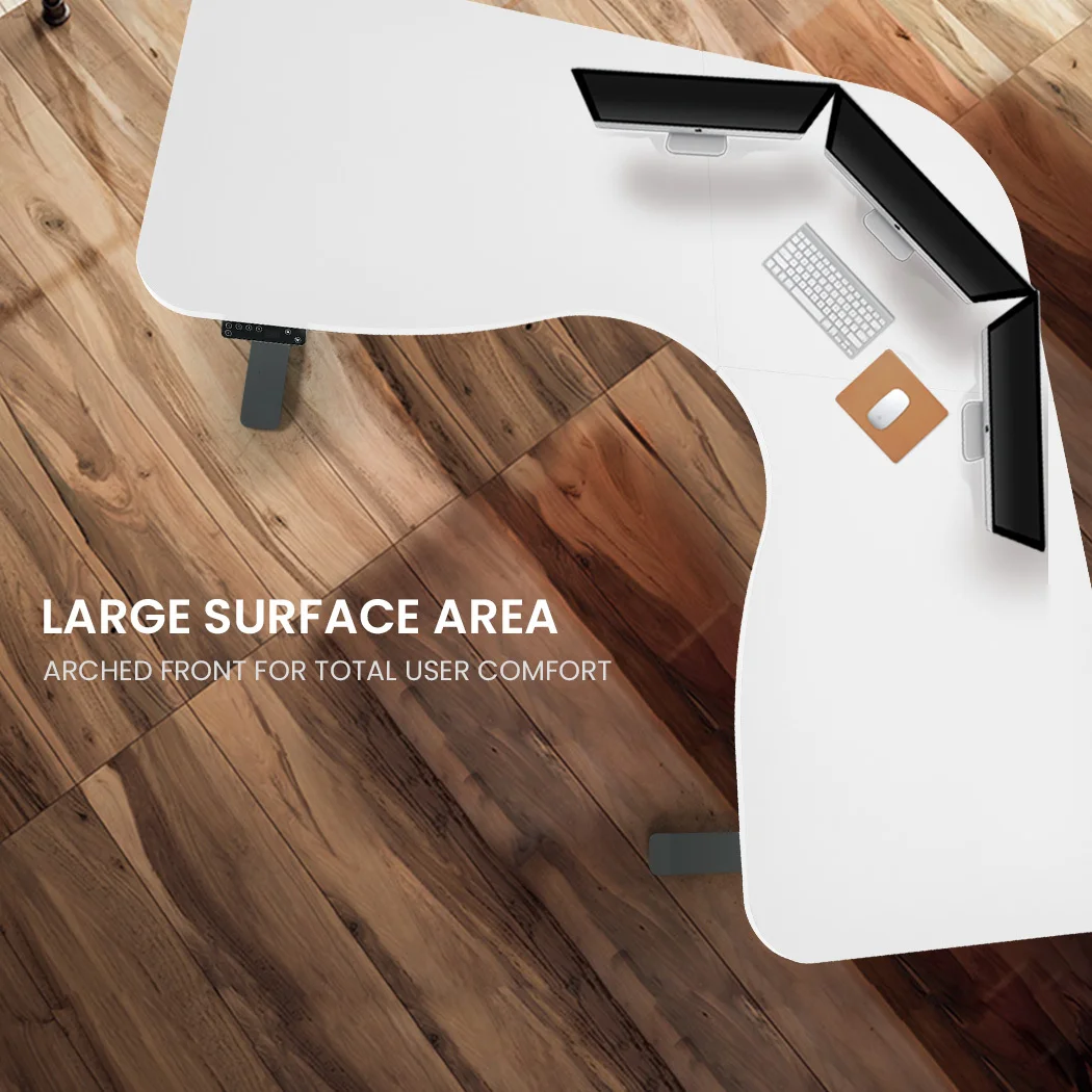 The innovative FORTIA Motorised Height Adjustable Sit/Stand Corner Desk has first and foremost been designed to provide comfort and health benefits. The large surface allows you to set up as many monitors as you need. You can also program up to 4 preset heights via the control panel, or adjust to any specific height, right up to 120cm.