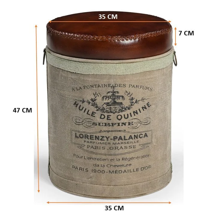 Canvas and leather are an inspired combination in our French Canvas Leather Perfume Ottoman. The cylindrical shaped ottoman features an exquisite leather mushroom style seat top with exposed stitching, and a canvas base that includes a vintage French perfume house motif. This is another perfect addition to your French vintage inspired space.