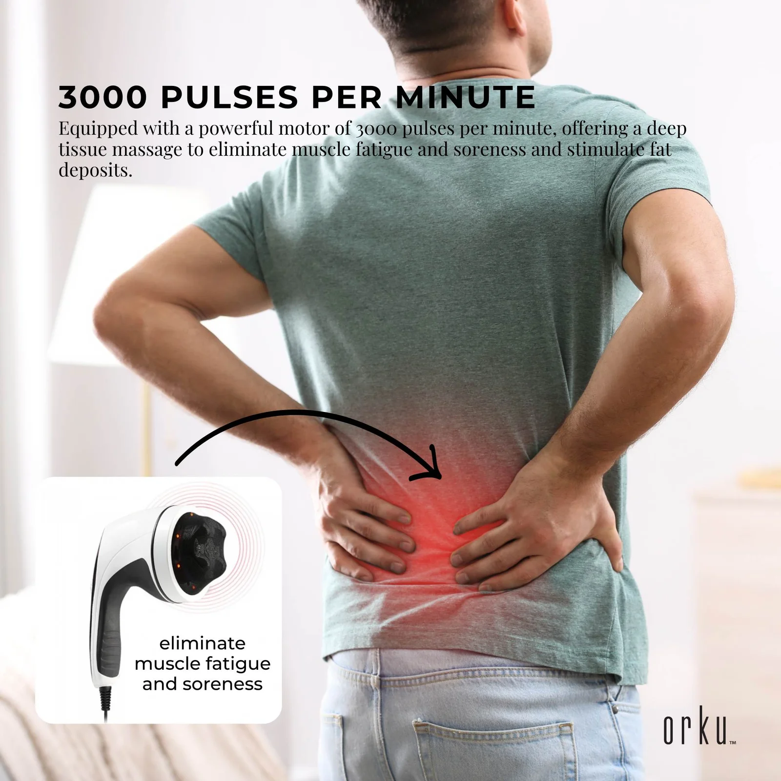 A professional handheld body massager with stylish ergonomic light weight design. Equipped with a powerful motor of 3000 pulses per minute, offering a deep tissue massage to eliminate muscle fatigue and soreness and stimulate fat deposits.