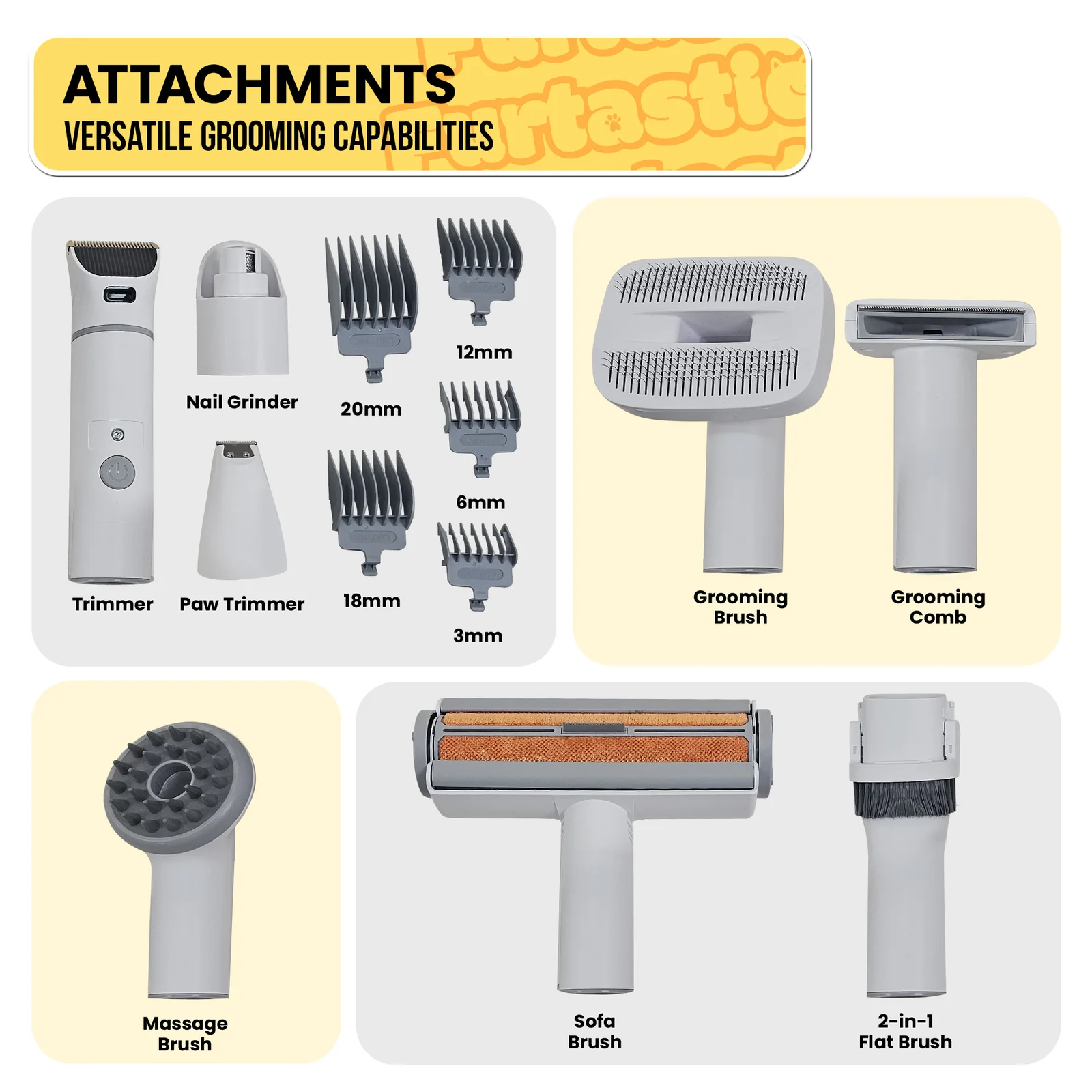 - 8 functional attachments: large trimmer, paw trimmer, grooming brush, grooming comb, nail grinder, massage brush, sofa brush and crevice brush