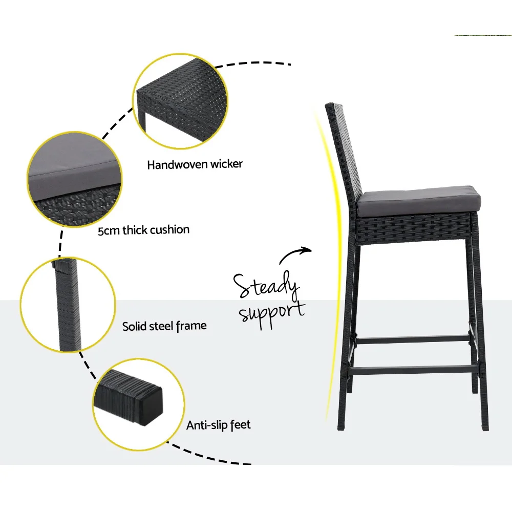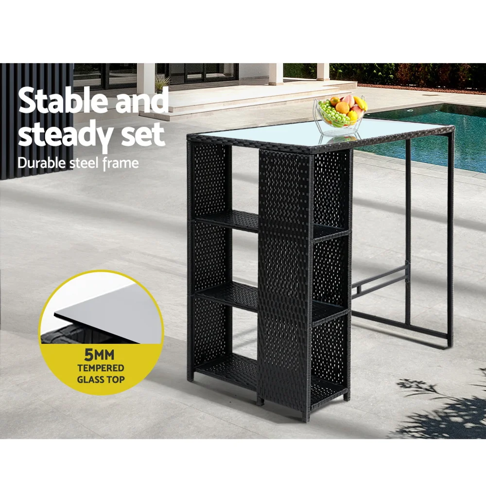 Looking to create a chic and gorgeous outdoor bar setting? The Gardeon 3-piece handwoven wicker outdoor bar table and stool set is a must purchase. It will liven up your outdoor space and help you achieve an elegant outdoor bar setting where you can enjoy day and night and summer and winter with your clan. The set comprises of two chairs and a matching table with storage shelves. Its beautiful and versatile design makes it perfect for any space. This outdoor set features a lovely wicker weave for a touch of tropical charm, and the PE wicker with heavy-duty, powder-coated steel frame is suitable for all-season use. The thick tempered glass tabletop boasting solid structure and classy design ensures strength, durability, and timeless look, and the chairs have been thoughtfully designed with thick foam and built-in footrest for comfort and convenience. This wicker outdoor bar table and stool set will withstand the test of time. Furthermore, the chairs come with removable cushions and cushion covers that can be removed to suit different seasons and keep clean. Now create a praise-worthy spot with just a little creativity that will wow your guests using our Gardeon wicker outdoor dining set.
