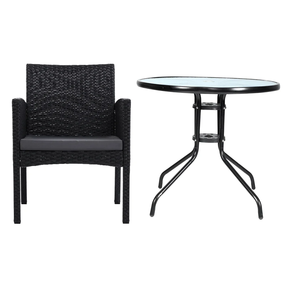 Enjoy the pleasant outdoors or have a nice chat with friends over a cuppa with our Gardeon Outdoor Bistro Set. With its chic and trendy profile, the set comes with a glass-top table and two wicker chairs. The elegant table is stunning in looks and equally as functional. The thick steel frame makes it durable and the 5mm thick tempered ripple glass does not only look stylish, it is easy to clean. Plus, there is a built-in hole for your parasol for you to relax outdoors for as long as you like during the hot summers without the fear of getting sunburnt. The chair is finished in meticulously weaved UV-resistant and weather-resistant PE wicker with a strong and sturdy steel frame construction. The exotic design, spacious seating and 5cm thick high-density foam cushions ensure comfort and style are always in place. Best of all, the removable and washable seat cushion cover makes cleaning up hassle-free. Together, the set is designed to please as well as stand up to the weather elements and the non-slip feet make the set suitable for use in even the most slippery of situations. With so much going for it, the bistro set certainly deserves its coveted space in your lovely backyard, deck or patio. Or even indoors for a unique presence.