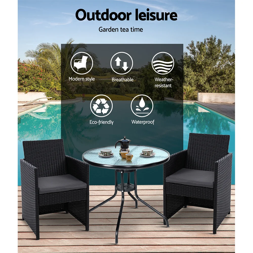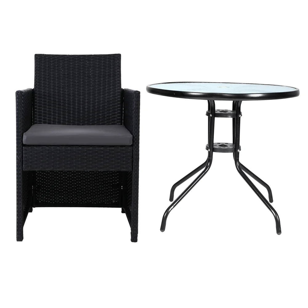 Enjoy the pleasant outdoors or have a nice chat with friends over a cuppa with our Gardeon Outdoor Bistro Set. With its chic and trendy profile, the set comes with a glass-top table and two wicker chairs. The elegant table is stunning in looks and equally as functional. The thick steel frame makes it durable and the 5mm thick tempered ripple glass does not only look stylish, it is easy to clean. Plus, there is a built-in hole for your parasol for you to relax outdoors for as long as you like during the hot summers without the fear of getting sunburnt. The chair is finished in meticulously weaved UV-resistant and weather-resistant PE wicker with a strong and sturdy steel frame construction. The exotic design, spacious seating and 5cm thick high-density foam cushions ensure comfort and style are always in place. Best of all, the removable and washable seat cushion cover makes cleaning up hassle-free. Together, the set is designed to please as well as stand up to the weather elements and the non-slip feet make the set suitable for use in even the most slippery of situations. With so much going for it, the bistro set certainly deserves its coveted space in your lovely backyard, deck or patio. Or even indoors for a unique presence.