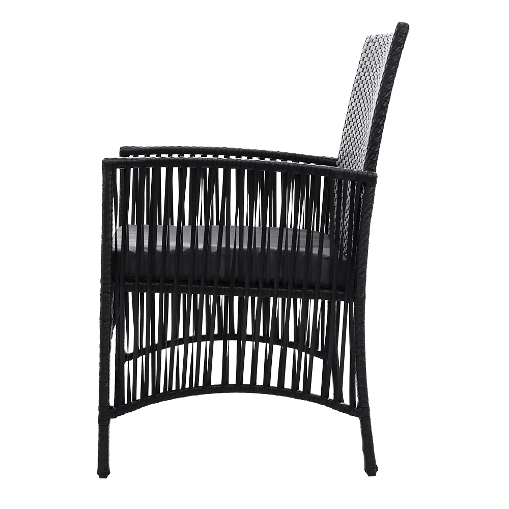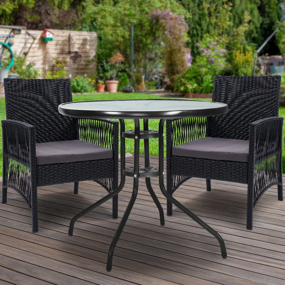 Enjoy the pleasant outdoors or have a nice chat with friends over a cuppa with our Gardeon Outdoor Bistro Set. With its chic and trendy profile, the set comes with a glass-top table and two wicker chairs. The elegant table is stunning in looks and equally as functional. The thick steel frame makes it durable and the 5mm thick tempered ripple glass does not only look stylish, it is easy to clean. Plus, there is a built-in hole for your parasol for you to relax outdoors for as long as you like during the hot summers without the fear of getting sunburnt. The chair is finished in meticulously weaved UV-resistant and weather-resistant PE wicker with a strong and sturdy steel frame construction. The exotic design, spacious seating and 5cm thick high-density foam cushions ensure comfort and style are always in place. Best of all, the removable and washable seat cushion cover makes cleaning up hassle-free. Together, the set is designed to please as well as stand up to the weather elements and the non-slip feet make the set suitable for use in even the most slippery of situations. With so much going for it, the bistro set certainly deserves its coveted space in your lovely backyard, deck or patio. Or even indoors for a unique presence.